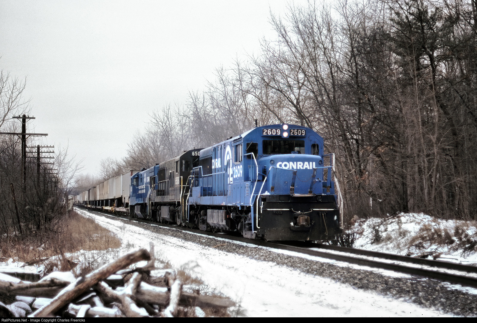 On the morning of January 20 TV9a, Tuesday through Saturday North Bergen to Chicago trailer van train, was led by the unusual consist of a U25B with a very damaged front porch, a U25C and a U28C. I shot this train at my usual spot in Haworth NJ and then did something I never did in those days, I jumped in the car and chased it north, catching it here as it passed through Norwood.