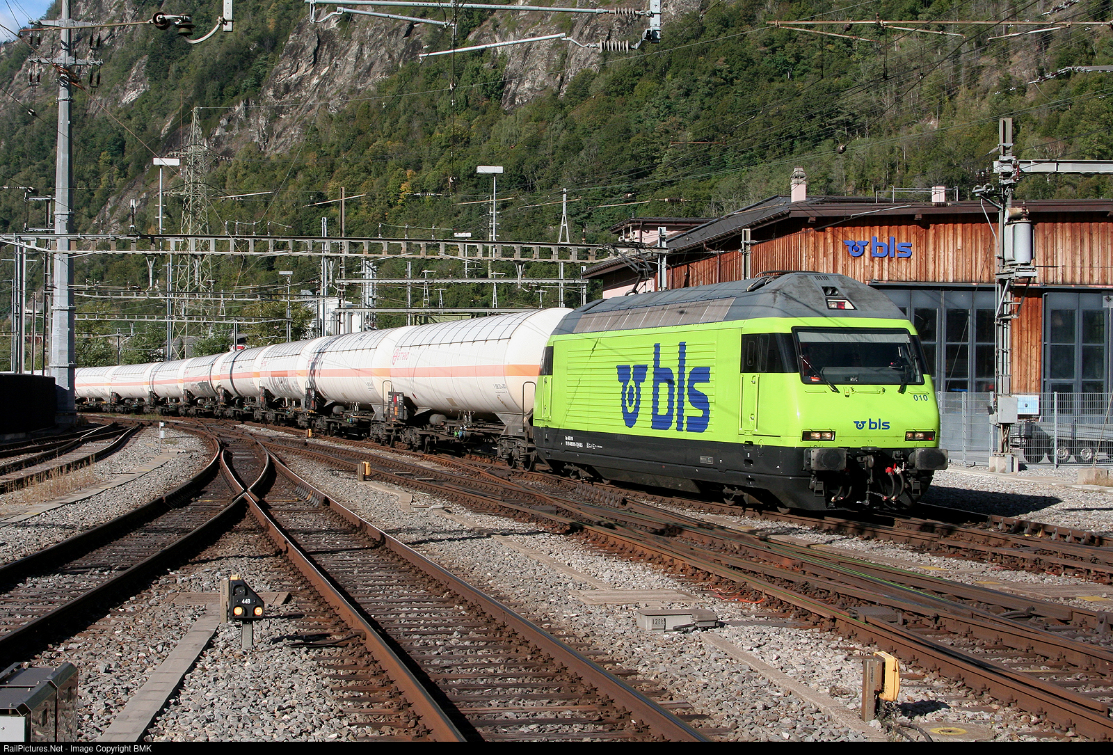BLS 010 leads a tank train into Brig Switzerland on a beautiful morning.