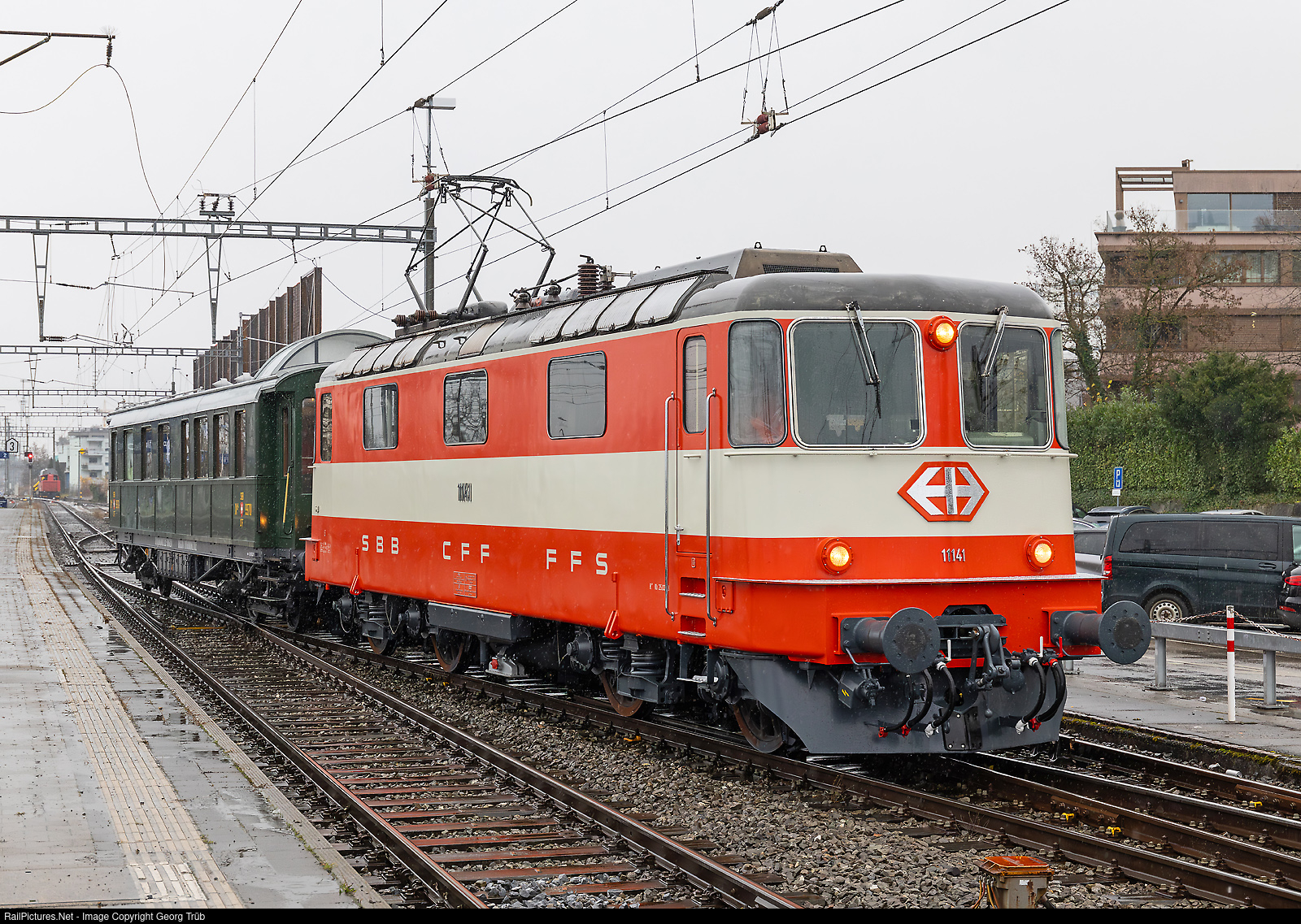 | Former SBB locomotive Re 4/4 II # 11141 (built 1967) of the Depot und Schienenfahrzeuge Koblenz (DSF), in the "Swiss-Express" paint scheme again since 14.09.2024, entering Pfäffikon SZ with train 31050 from Linthal, on a journey with the privately owned former SBB dynamometer car Xd4 # 99701 based in Winterthur. |