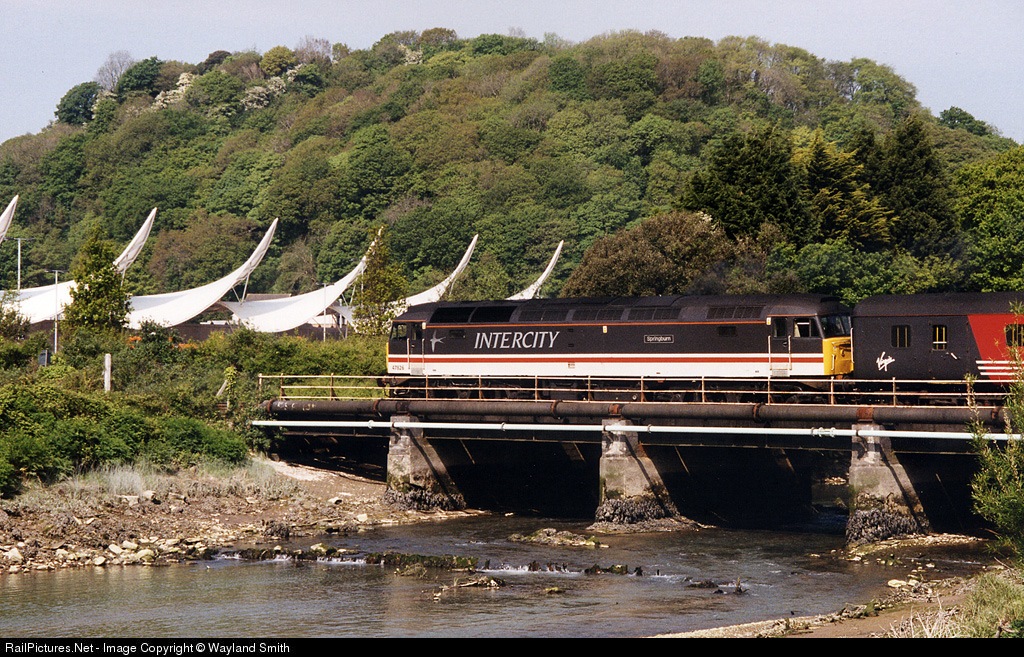 | Still sporting nationalised BR Intercity livery, 47826 crosses the River Plym near its desination with the 0605 Derby to Plymouth service. |