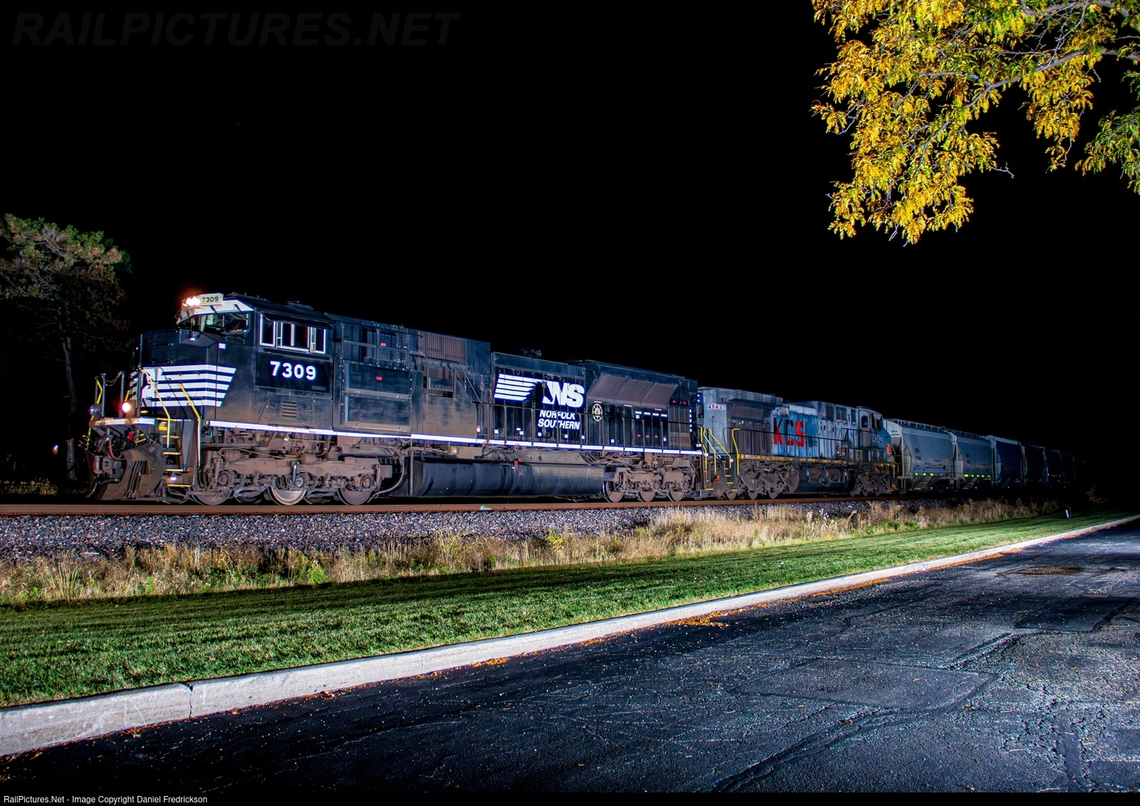 NS 7309 (SD70ACu) and KCSM 4542 (AC4400CW) lead CPKC sand train 640 through Des Plaines, IL.