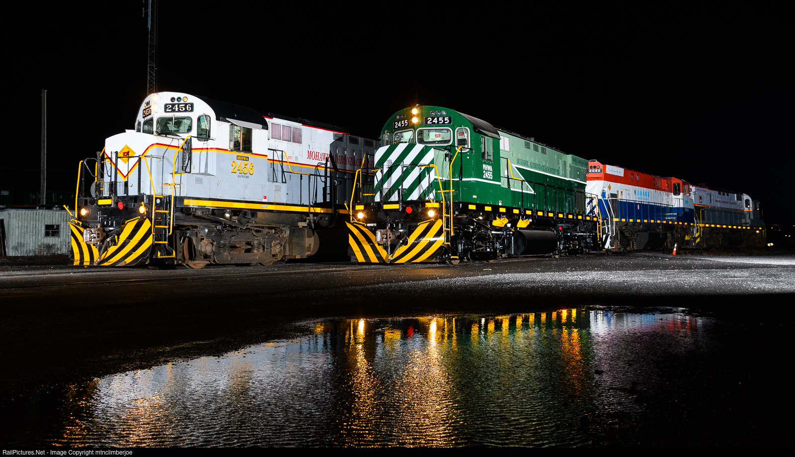 Debuting the Mohawk, Adirondak & Northern Railroad's Alco C425 2455's repainting into a BC Rail inspired two-tone green paint scheme, a portion of the railroad's roster was posed at the engine house in Utica, New York for a night time family portrait. All four locomotives present spent time on BC Rail, with 2042 still wearing the BC Rail red, white & blue. MHWA 2453 and 2456, sisters to the 2455, wear the corporate colors of parent GVT Rail. All three C425's were originally built by Alco for the Erie Lackawanna.