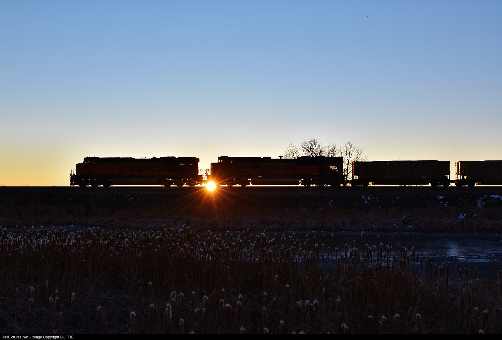 | BNSF 6114 (ES44AC) muscles a loaded coal train towards Denver, Colorado, passing through Barr Lake at sunrise.