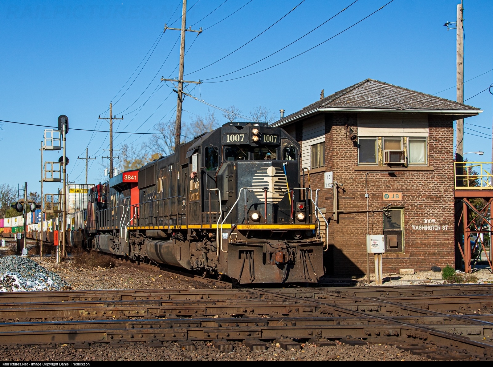 | IC 1007, an Illinois Central SD70 still wearing the classic "Deathstar" scheme, leads CN freight M356 southbound past former EJ&E "JB" Tower in West Chicago, IL. Cool to capture a locomotive like this with the first string of cars behind the leaders composed of doublestacks! |