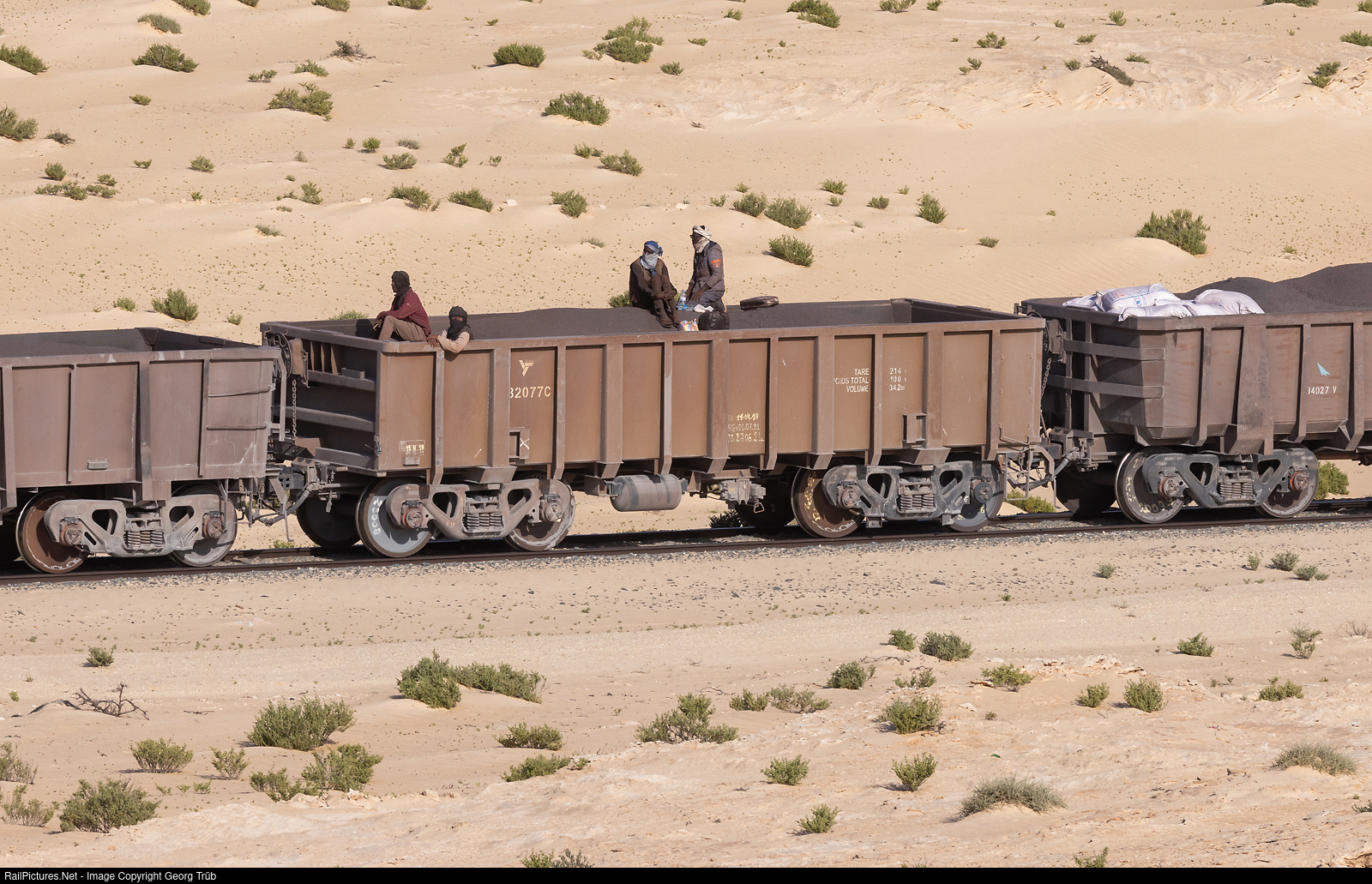 The loaded and empty ore trains between the town of Nouadhibou on the Atlantic and the area of the mines in the Zouérate region have always been used by the locals, like here on the train M4, as there is no road, only a sandy track. Trade is carried out, for example goats or dromedaries are transported to the coast, and freshly caught fish are transported inland. For a few years now, the trains have also been increasingly used by adventurers from all over the world.