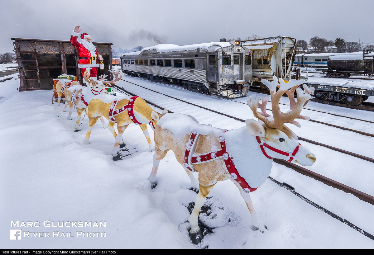 | Santa's Sleigh In Danbury. The Danbury Railway Museum's Snow Clipper for the First Gift Of Christmas Express starts with a train ride in the Danbury Rail Yard. Every child's parents can drop off a wrapped gift for Santa & Mrs. Claus to give them at the end (DRM then makes sure that the Clauses know who they are meeting). New Haven 32 (RDC-1, Budd, 1953) is pictured passing one of the many Christmas displays along the route. |