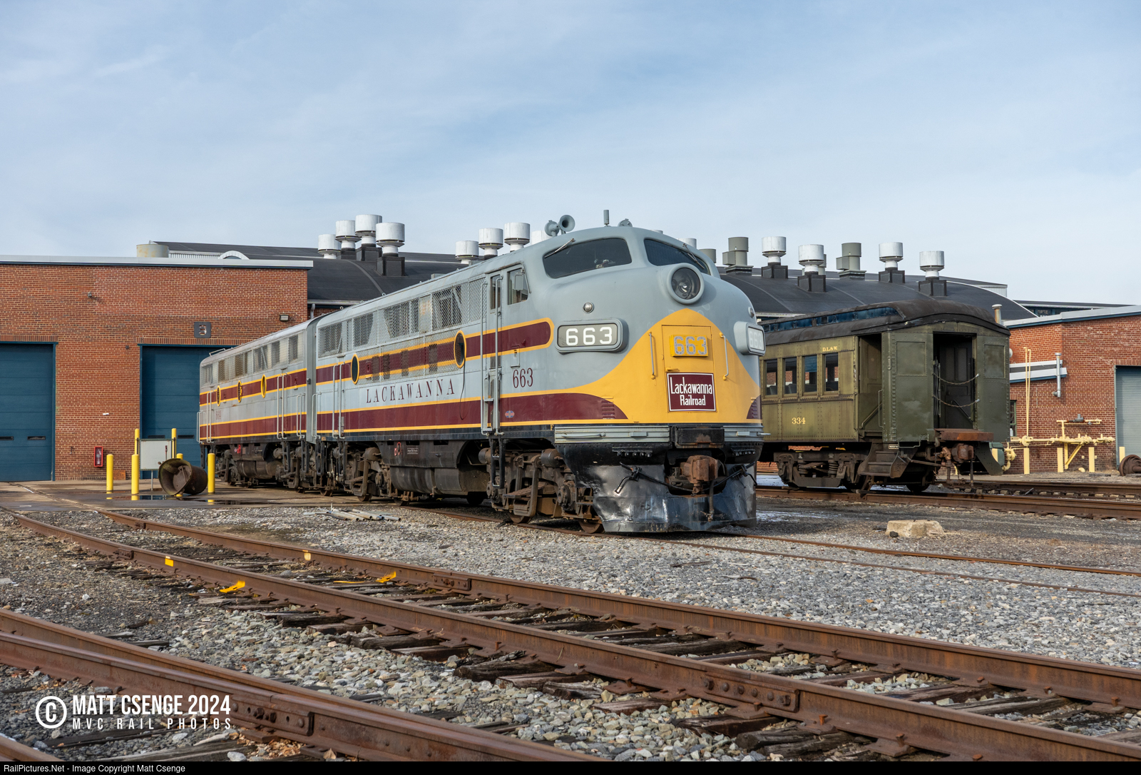 Two Outta Three Ain't Bad. Delaware, Lackawanna & Western (DL&W) F3A no. 663 and F7B 664B are seen outside the shop at Steamtown National Historic Site, alongside DL&W coach 334. F3A 664 is also at Steamtown, but was inside the shop undergoing maintenance.