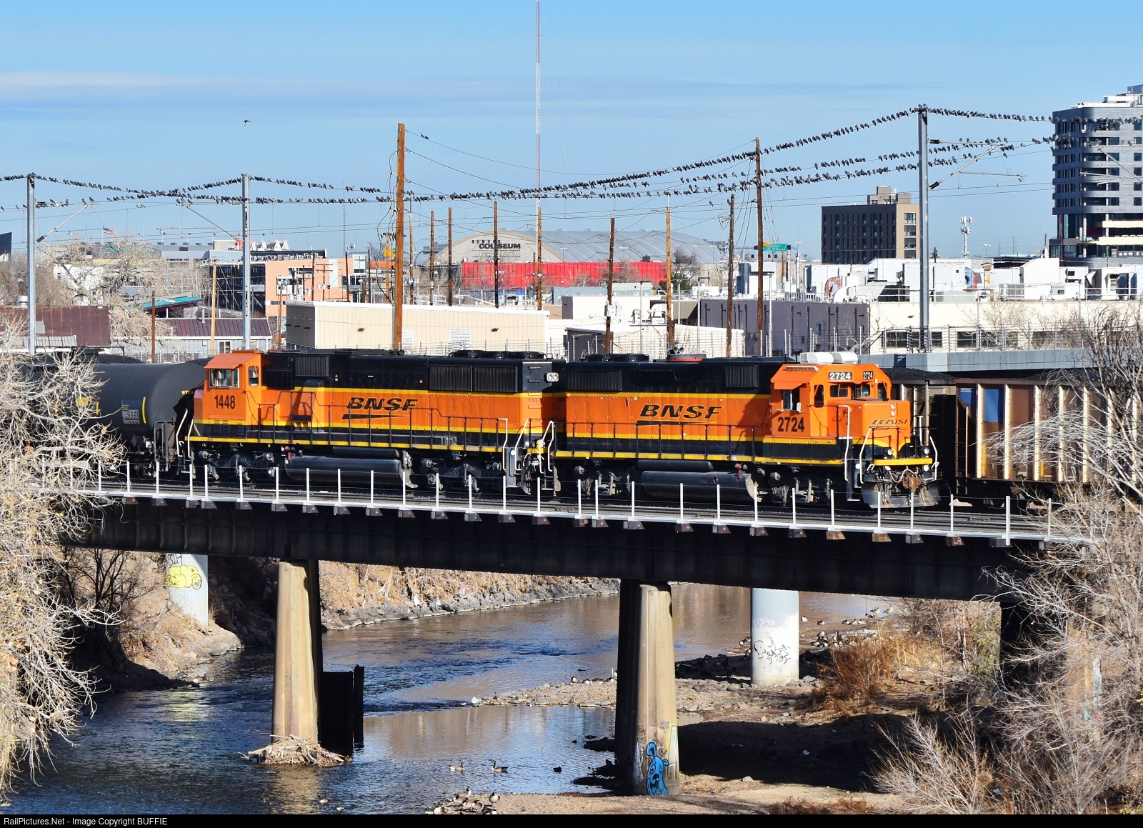 | BNSF 2724 (GP39-2) crosses the South Platte River with a cut of cars that will then get sorted back into the yard in Denver, Colorado.