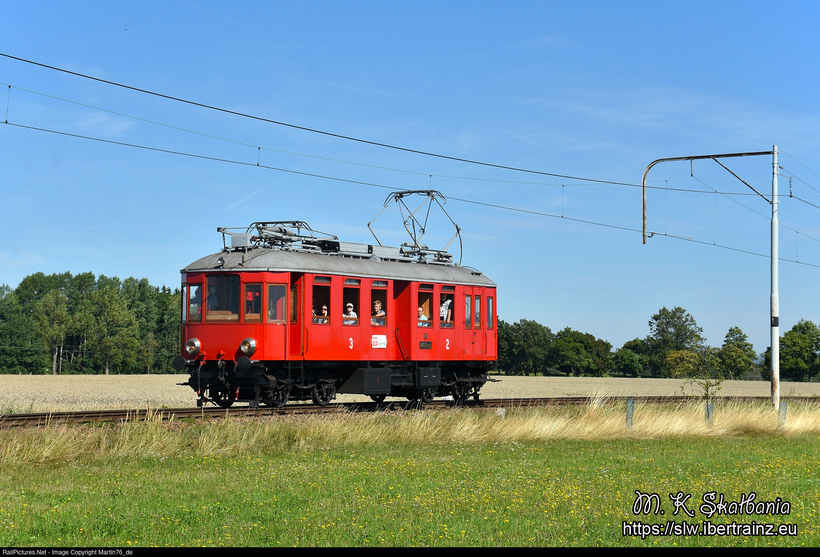 The electric passenger car M400.001 as passenger train from Tabor to Bechyne.