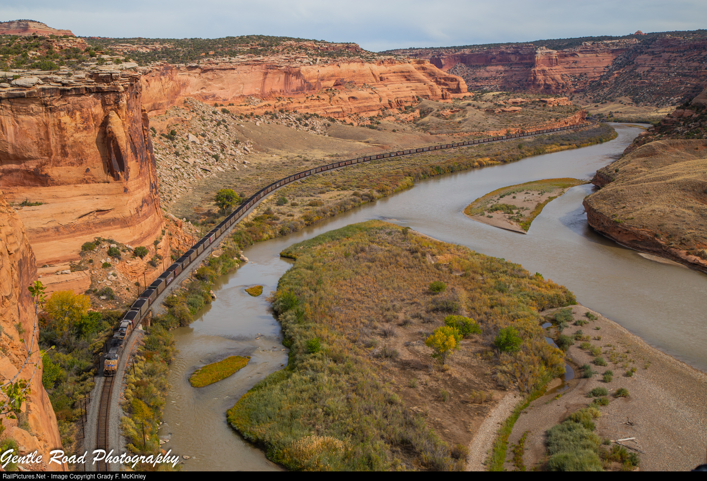 | Loaded coal for Tuscon, AZ snakes it's way along through Ruby Canyon near Utaline, CO on the former Rio Grande. |