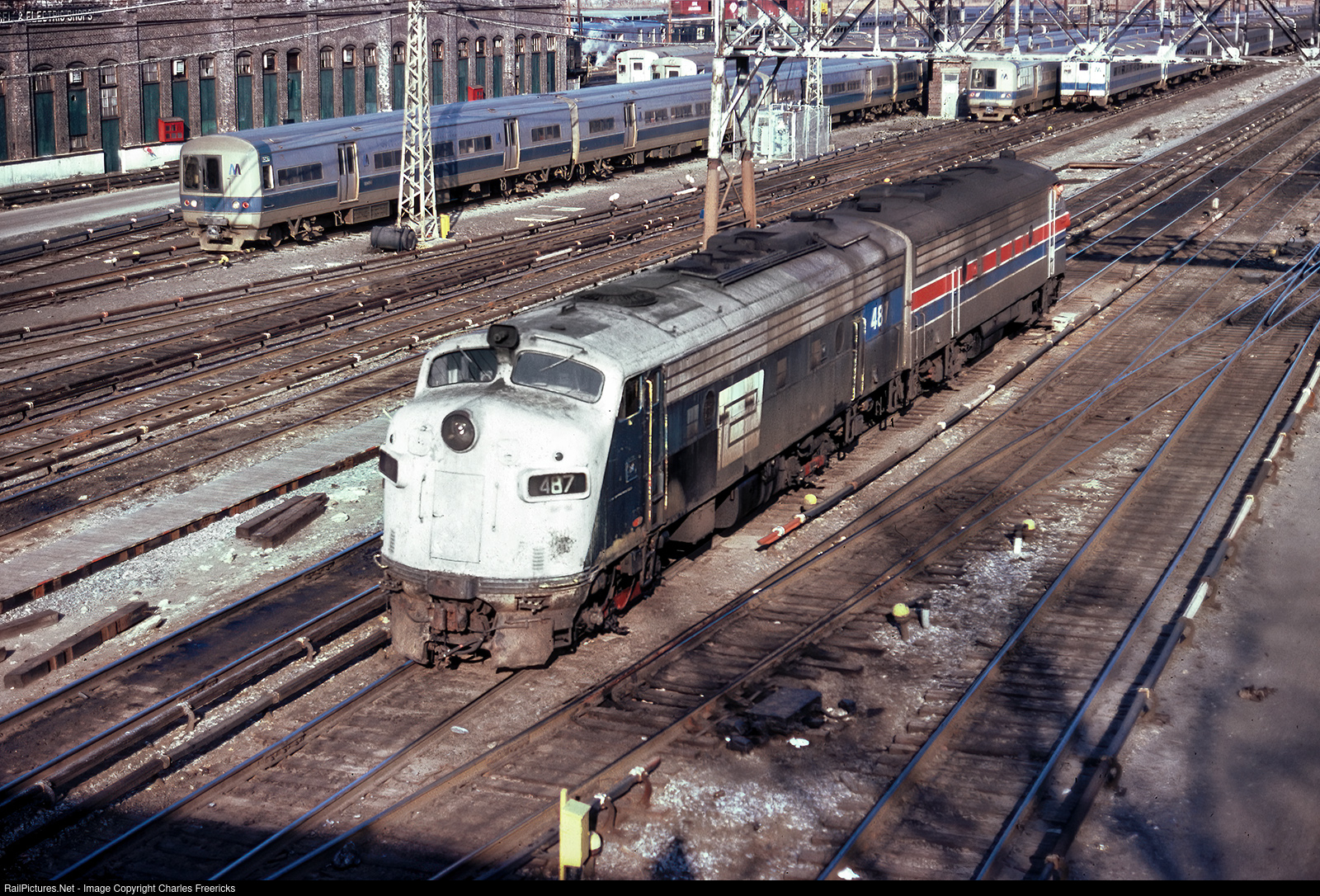 Amtrak acquired 12 ex Penn Central, nee New Haven, FL9s from Conrail in 1976. Over two and one half years later, Amtrak 487 was still in its MTA/Penn Central scheme. Amtrak 489 behind it was in Amtrak Phase II paint. Both units are seen here after having pulled the Niagara Rainbow from Grand Central Terminal to Croton-Harmon, where they are being swapped for an F40PH that will bring the train the rest of the way.