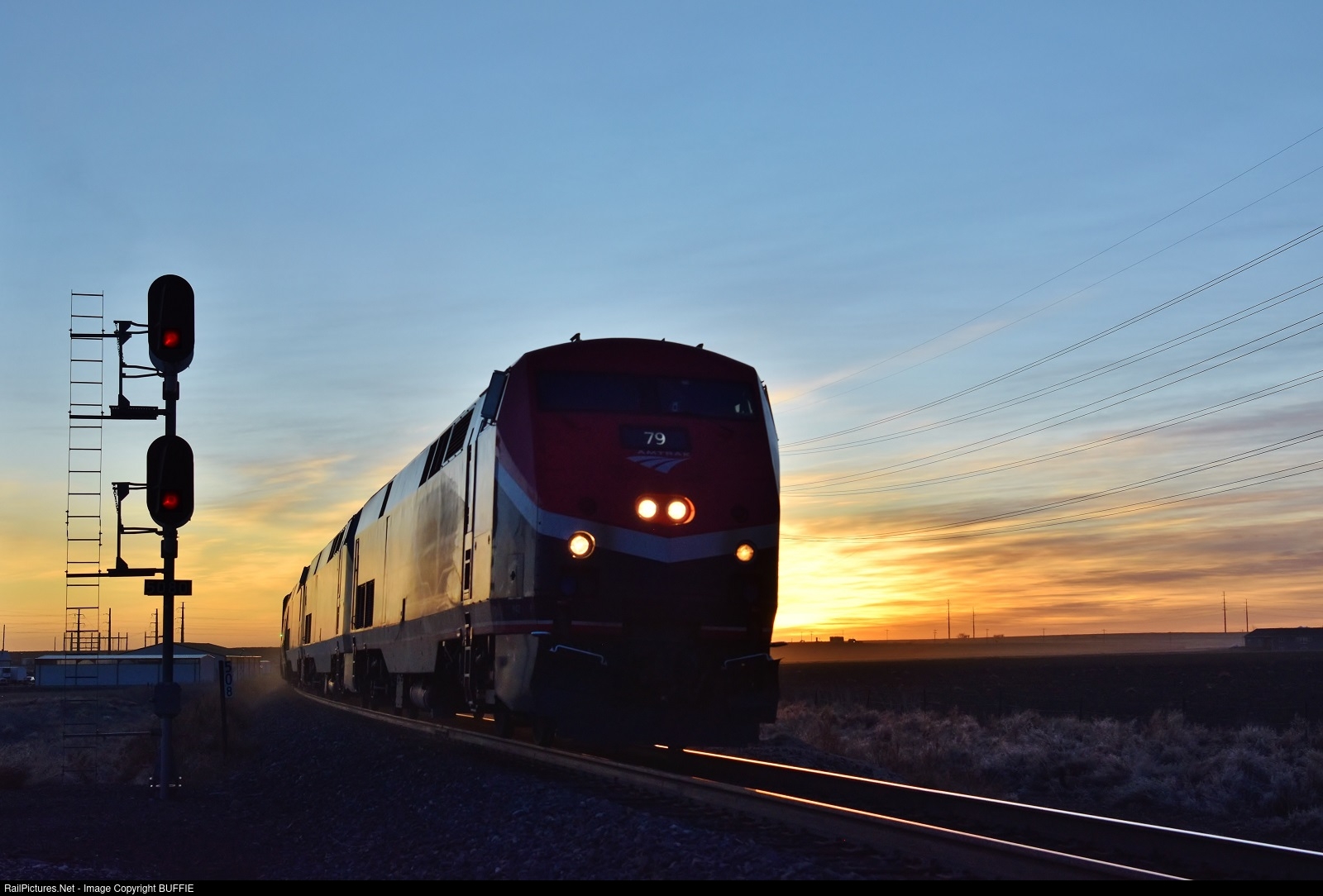 | Amtrak Phase VII engine #79 (P42DC) leads the California Zephyr 5 train through Keenesburg, Colorado at sunrise as it heads to Denver on the Brush Sub.
