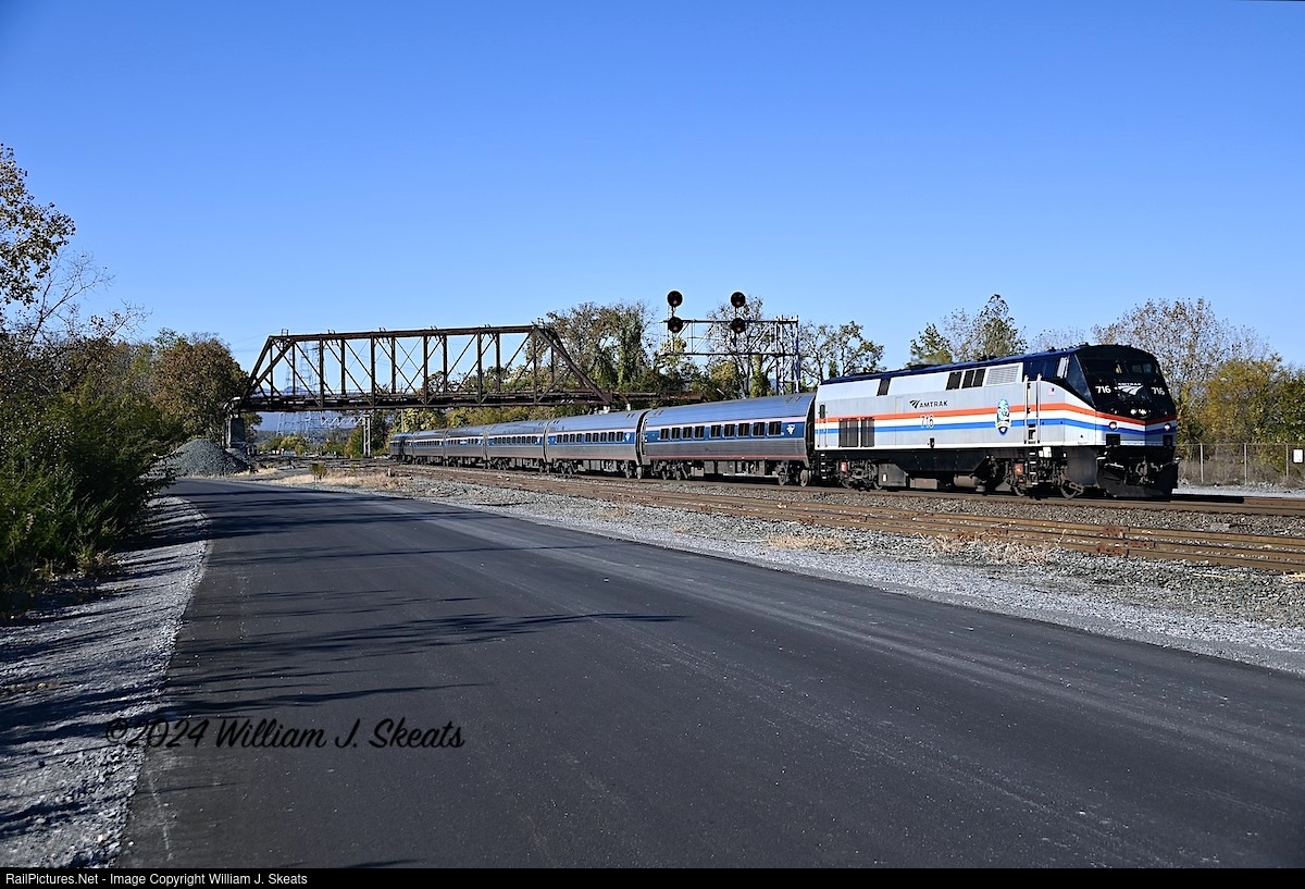 | Amtrak Adirondack Train 69 to Montreal heading through CP 114 in Hudson, NY. P32AC-DM 716 and six Amfleets including a cafe car on the rear of the consist.