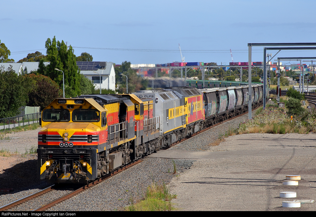 BRM001-4911-CLF3-CLP9 with 7MC5 empty grain train to NSW pass through Sunshine.