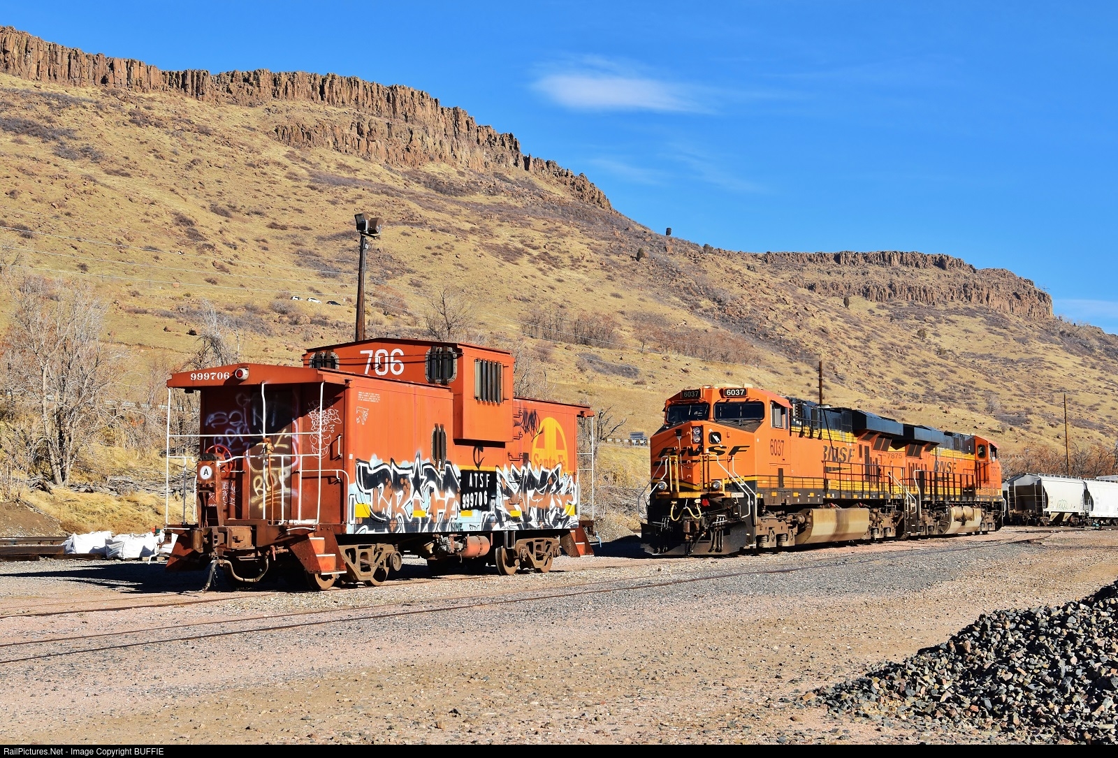 BNSF 6037 (ES44AC) sits in the yard in Golden, Colorado with a former AT&SF caboose, which is used as a shoving platform for nearby customers.