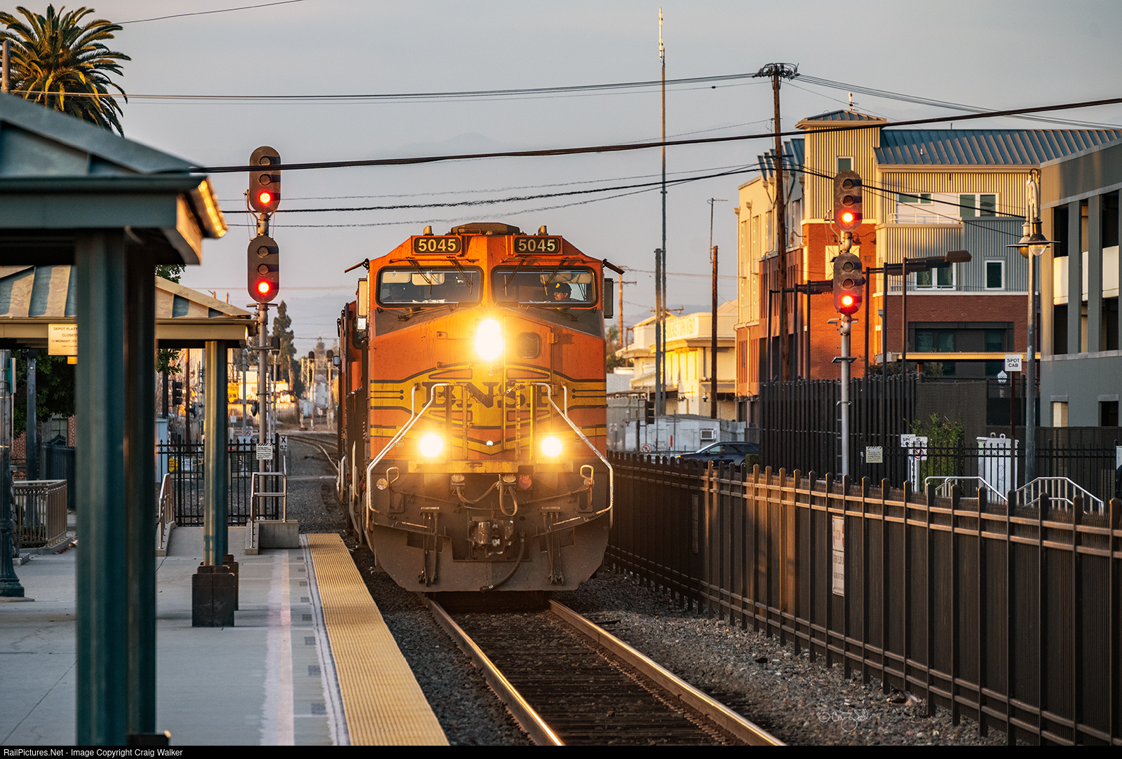 The winter solstice, or hibernal solstice, occurs when either of Earth's poles reaches its maximum tilt away from the Sun. This year, the Northern Hemisphere’s winter solstice was on December 21, making it dicey to catch BNSF Railway train H-BARSDG, crossing from Track 1 to Track 2 as it comes off Metrolink's Olive Sub and onto Metrolink's Orange Sub heading from Barstow to San Diego, even though it was running during daylight hours … barely … as this was the Northern Hemisphere's shortest day of the year. (This train usually operates after dark, even in the summer.) BNSF Dash 9-44CW 5045 (built by General Electric in July 2004) leads this train, passing through Orange at 4:33 pm (16:33) with long shadows already stretching across the mainline. Total darkness will envelop this area in about 30 minutes. As the solstice technically occurred at 1:21 am Pacific Time, this is the first train I've photographed this winter! (Orange, California – December 21, 2024)