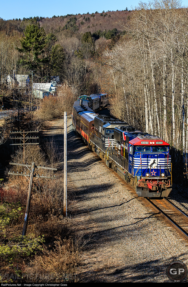 | Powering out of the village, the 2024 Toys for Tots train NS 975 with the 6290 in-charge rounds towards Afton approaching the Route 7 overpass. A CP era "No Trespassing" sign still remains on the old telegraph pole as much of the D&H is untouched with insulators still shining bright in the sun. |