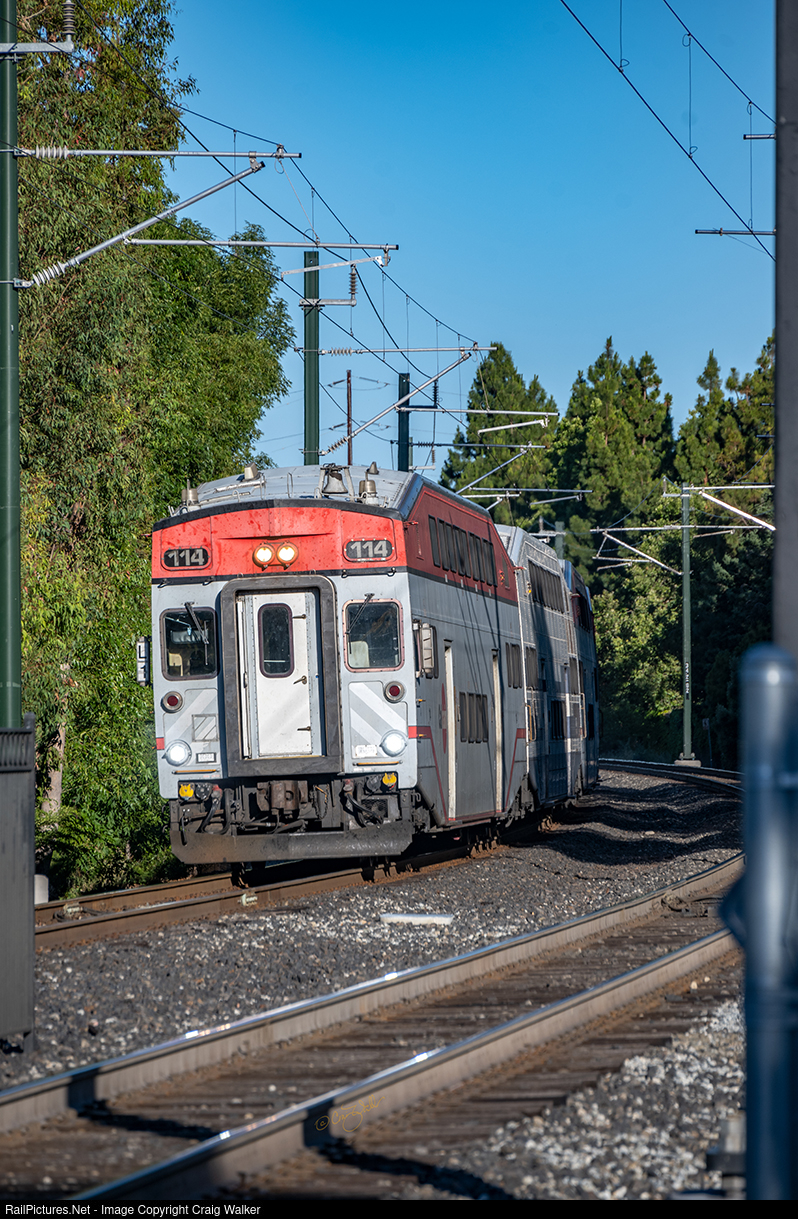 Rolling in to Caltrain's San Antonio station is Caltrain 313, with cab/bike car 114 leading, and F40PH-2 915 for power on the rear. These commuter trains are operated by the Peninsula Corridor Joint Powers Board, which will soon be replacing these diesel-powered trains with new Electric Multiple Unit trains built by Stadler Rail - which explains the catenary already in place. (Mountain View, California – June 14, 2024)