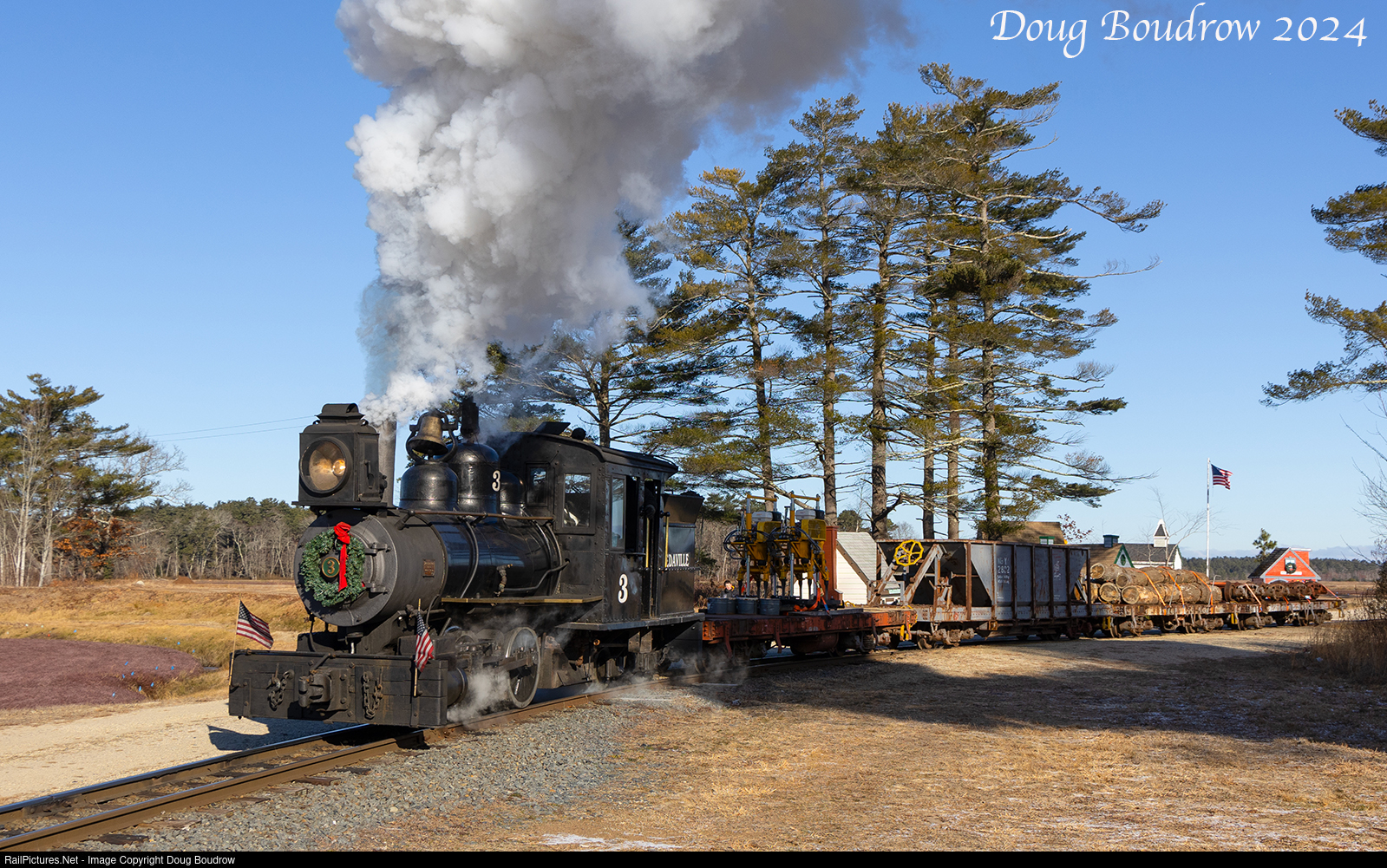 On December 22nd, 2024 Edaville Railroad hosted a photography charter using Monson Railroad #3 and a short freight train. Multiple run-bys were performed in places normally off-limits to the public. The train is passing the mock-up village known as "Peacedale" which is part of the Festival Of Lights.