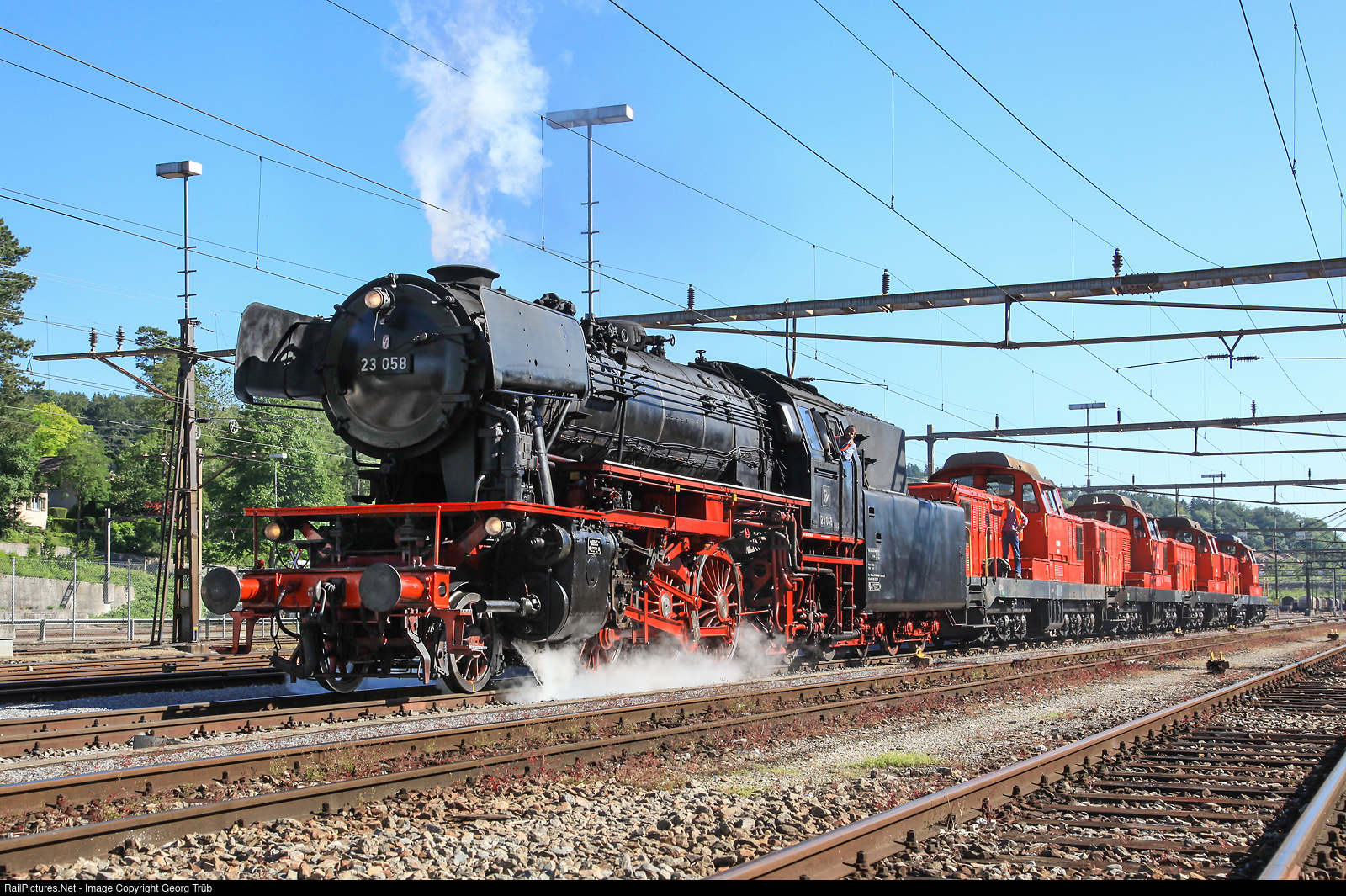 The 2-6-2 former Deutsche Bundesbahn steamlocomotive 23 # 058 of the Eurovapor pulls 4 former SBB diesellocomotives Bm 6/6 # 18504, 18508, 18503 and 18513 from Winterthur freight yard to the shed J in depot Winterthur. The 23 # 058 was based in Winterthur for some times and the privately owned Bm 6/6 locomotives of the Schorno Locomotive Management Gmbh had to be moved for this reason.