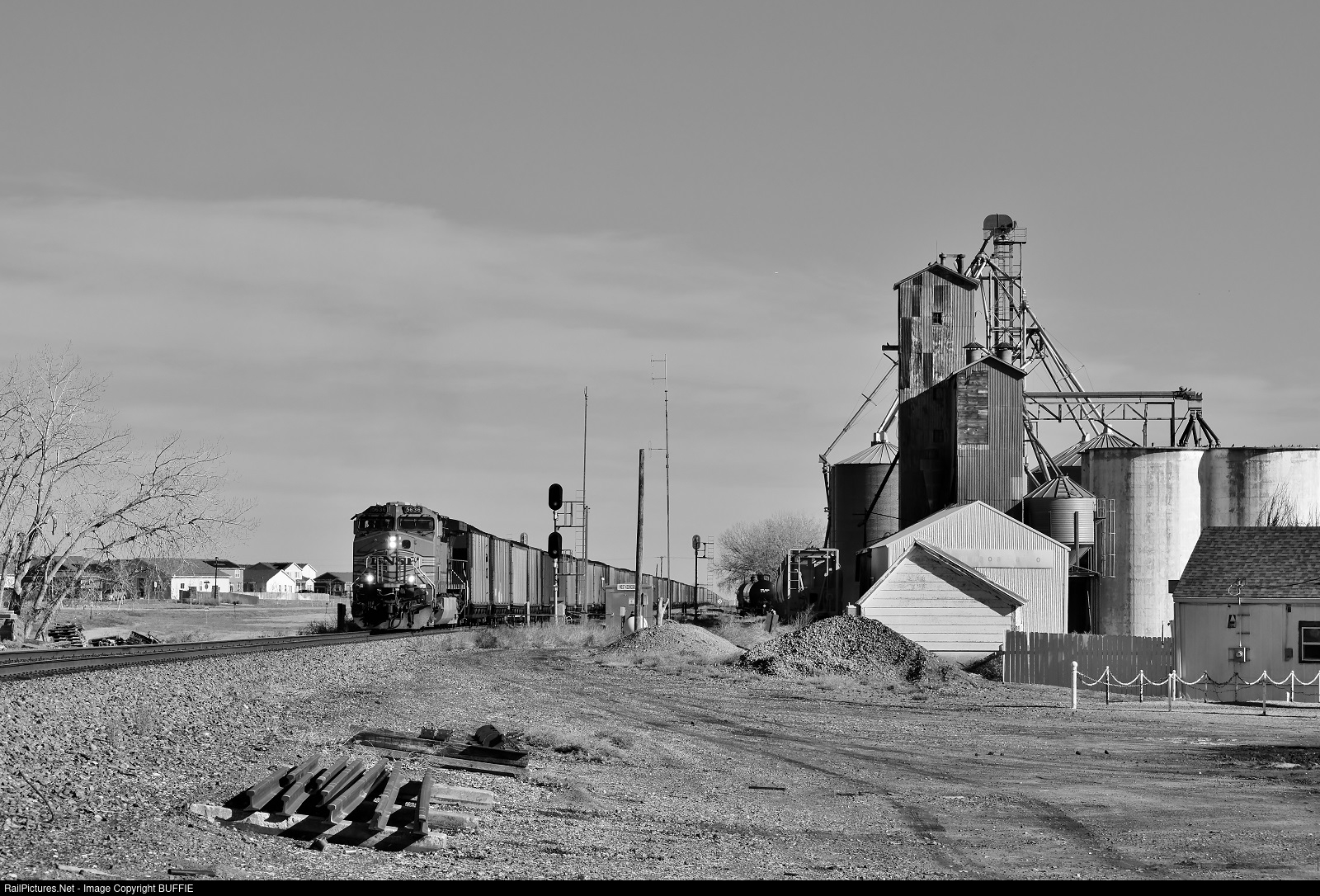BNSF 5636 (AC4400CW) runs past the silo in Keenesburg, Colorado as it heads to Denver on the Brush Sub.