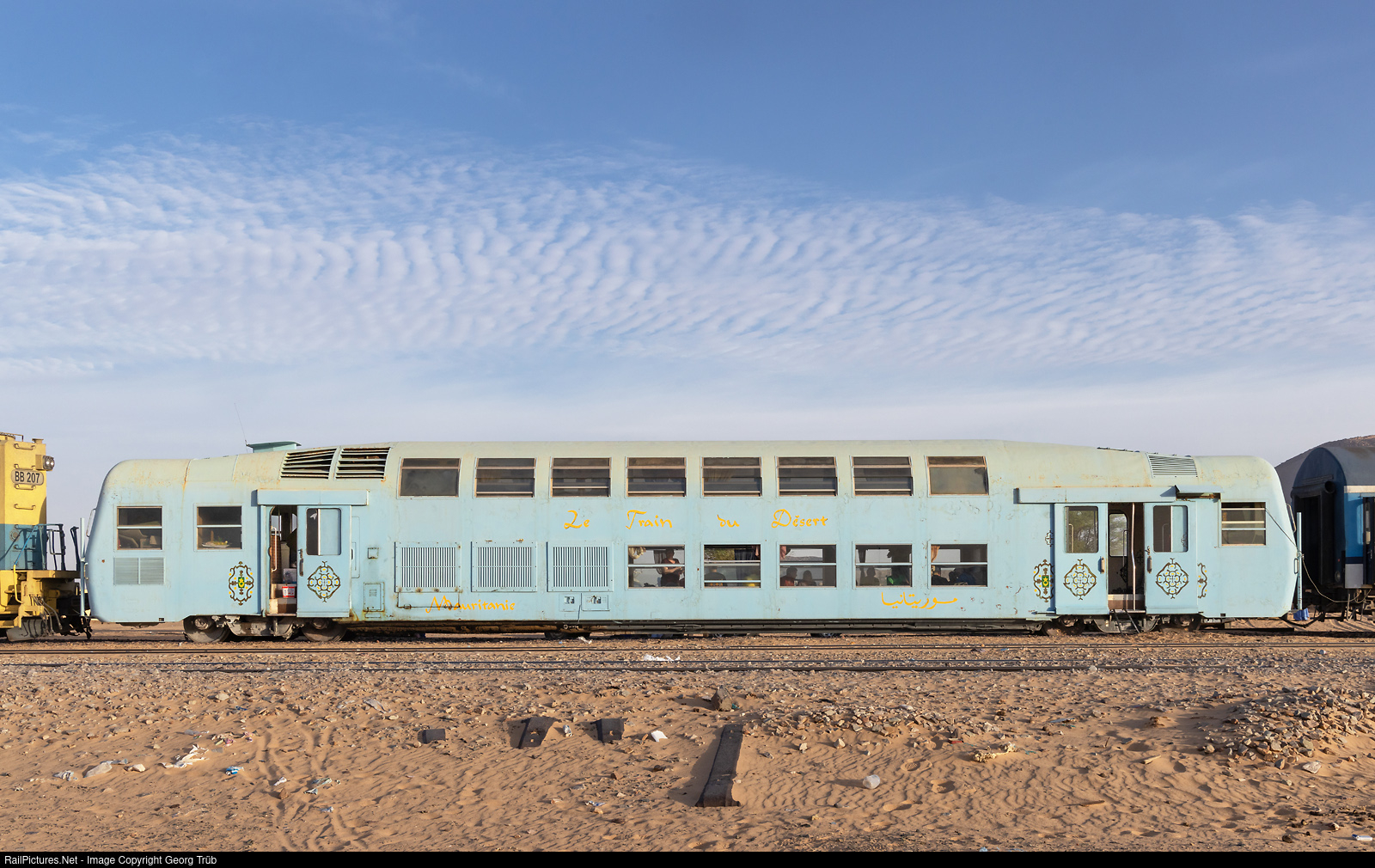 Morning meal is served in the saloon car of the “Train du Désert” at 08 AM. The double-decker vehicle was originally a diesel railcar, with the engine compartment located behind the blinds on the lower floor on the left. The light blue color refers to the “blue men” of the desert, the Moors, who usually wore wide light blue clothing. The ornaments are from the area of Oualata (Walata), a town in the desert, meeting point of the caravans and the Mecca pilgrims (today an UNESCO World Heritage Site together with the towns of Chinguetti, Ouadane and Tichitt). The history of this vehicle, from Wikipedia: The A2n # 001 railcar was an experimental rolling stock built in Italy by the CaFiCi consortium in 1982. Tested and proven on several regional railways, this vehicle never entered regular service. The railcar was conceived by exploiting the experience fine-tuned in the construction of double-decker towed vehicles gained in Italy by the Casaralta workshops (Bologna) under license from CIMT Lorraine, from whose trains in service on the Parisian “banlieue” had been derived similar trainsets, with a slightly more tapered outline, built first for Ferrovie Nord Milano and then for Ferrovie dello Stato. The concept behind the experiment was research on a rolling stock, albeit lightweight, with a higher carrying capacity than the railcars used at the time. The goal set was to offer a relatively high transport capacity on lines with little traffic, estimated at about 40-50% more passengers than an equivalent conventional railcar, while at the same time having reduced fuel consumption and saving about 20% in investment and operating costs. Thus an unusual motorized railcar on a single bogie was born, which in its outward shape recalled the aforementioned double-decker carriages. The specimen was built by a company called CaFiCi International, based in Geneva, from the initials of the three partners who formed it namely the aforementioned Casaralta and CIMT Lorraine together with the then FIAT Ferroviaria of Savigliano, a specialist in the construction of light equipment. The motorization was supplied by FIAT (IVECO 828 SRI 4-stroke, 8-cylinder V-cylinder powerplant) and involved only one of the two bogies, themselves derived from those in service on the double-decker carriages then being delivered by Casaralta, with secondary air suspension and mixed braking with blocks and discs. The layout of the spaces was such as to create in practice 4 distinct spaces: the two vestibules provided access to the end compartments, with a total capacity of 17, and to the two central decks, with a capacity of 60 seats the upper one and 48 the lower one, respectively. History: Leaving the factory in 1982, the vehicle was tested the following year on some Piedmontese lines, running several times on the Turin-Trofarello and Fossano-Limone Piemonte routes. In 1984, after a few weeks of testing on the ACT network in Reggio Emilia and along the Suzzara-Ferrara (FSF) railroad,[1] the railcar moved again to Piedmont and the French Riviera, where on behalf of the SNCF it made several test runs on the Cuneo-Nice line; the low power of the single engine was put to the test by the ramps imposed by the Maritime Alps, showing less than brilliant performance. FIAT later organized another series of test runs in 1986 on the Brescia-Iseo-Edolo railway, then operated by SNFT, which in turn judged it unsuitable for the demanding services of the Val Camonica. During the same period, under a loan-for-use arrangement, the railcar was also used by SATTI for services on the Canavesana railway. The first buyer for the A2n 001 came in 1988, when the Swiss association Vapeur Val-de-Travers purchased it and had it transferred to its depot in Neuchâtel, using it, moreover, on an occasional basis. A new change of ownership took place in 1997, when the railcar was purchased by SNIM - National Industries and Mines Company of Mauritania, which, after installing air conditioning (which was never done), intended to employ it once again in a tourist service, on the Nouadhibou-Zouérate route. Due to its underperformance and its nature as a unique specimen, the railcar was eventually demotorized and from about 1998 was occasionally found to be employed as a trailer on the tourist service “the desert train.”