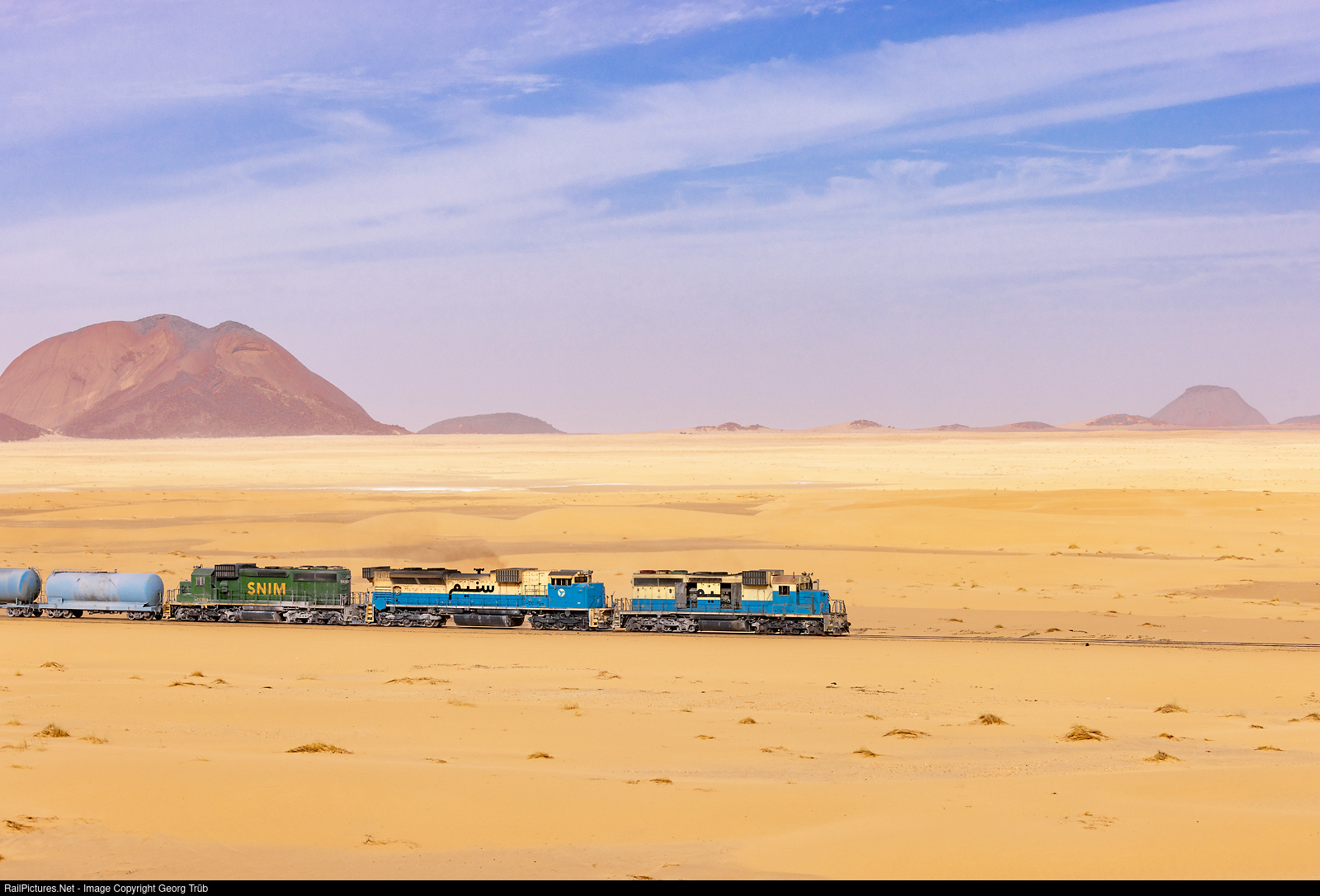 About 3 kilometers north of the railroad line through the Mauritanian desert lies the largest monolith in Africa, Ben Amira, the second largest in the world. Its height is given as 633 meters, but this is not true. It is around 550 meters high, rising about 370 meters out of the desert. Around 5 kilometers further on is the smaller monolith Aisha, around 220 meters above the desert. We are 10 kilometers east of Ben Amira station, the Ben Amira monolith (left) is 10 kilometers away, the Aisha (right) around 17 kilometers. The empty ore train V5 from Nouadhibou on the Atlantic to the mines near Zouérate is pulled by the diesel locomotives SDL40-2 CC # 114, SD70ACS CC # 125 and the SDL40-2 CC # 109 (in the original green livery). The train, which is around 2 kilometers long, has 7 filled water tank cars at the front, which were filled in Boulenouar at PK 96.
