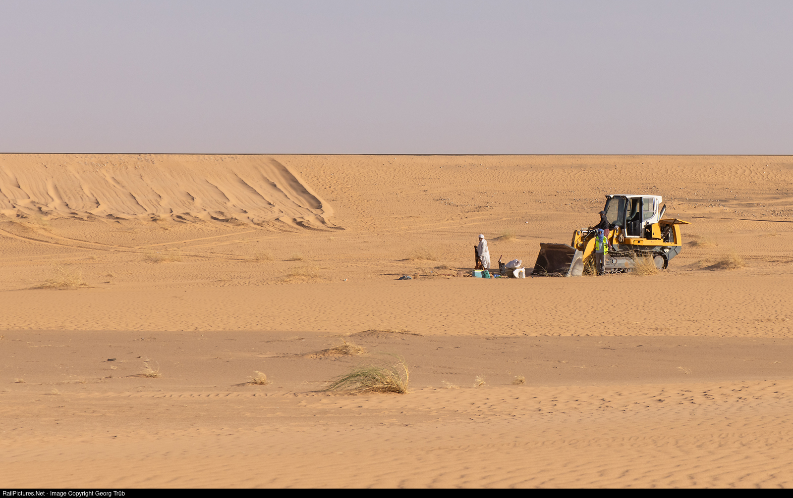It is easy to imagine that drifting sand plays a major role on a railroad line through the Sahara desert. The track maintenance teams use shovels and manpower or, as here, a bulldozer. They will soon start today's work, on the left you can see the previous day's work.