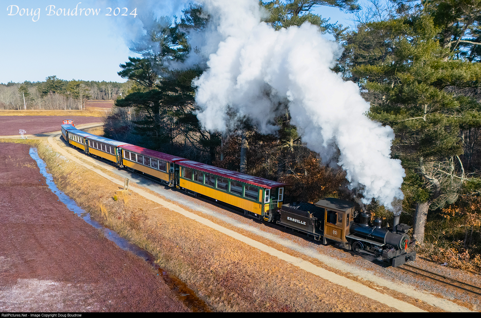 On December 22nd, 2024 Edaville Railroad hosted a photography charter using Monson Railroad #3 and a short freight train. Multiple run-bys were performed in places normally off-limits to the public. The photographers rode in coaches behind Edaville #11. In this scene, the passenger train is rolling through the Cranberry Bogs near Pumphouse 5.