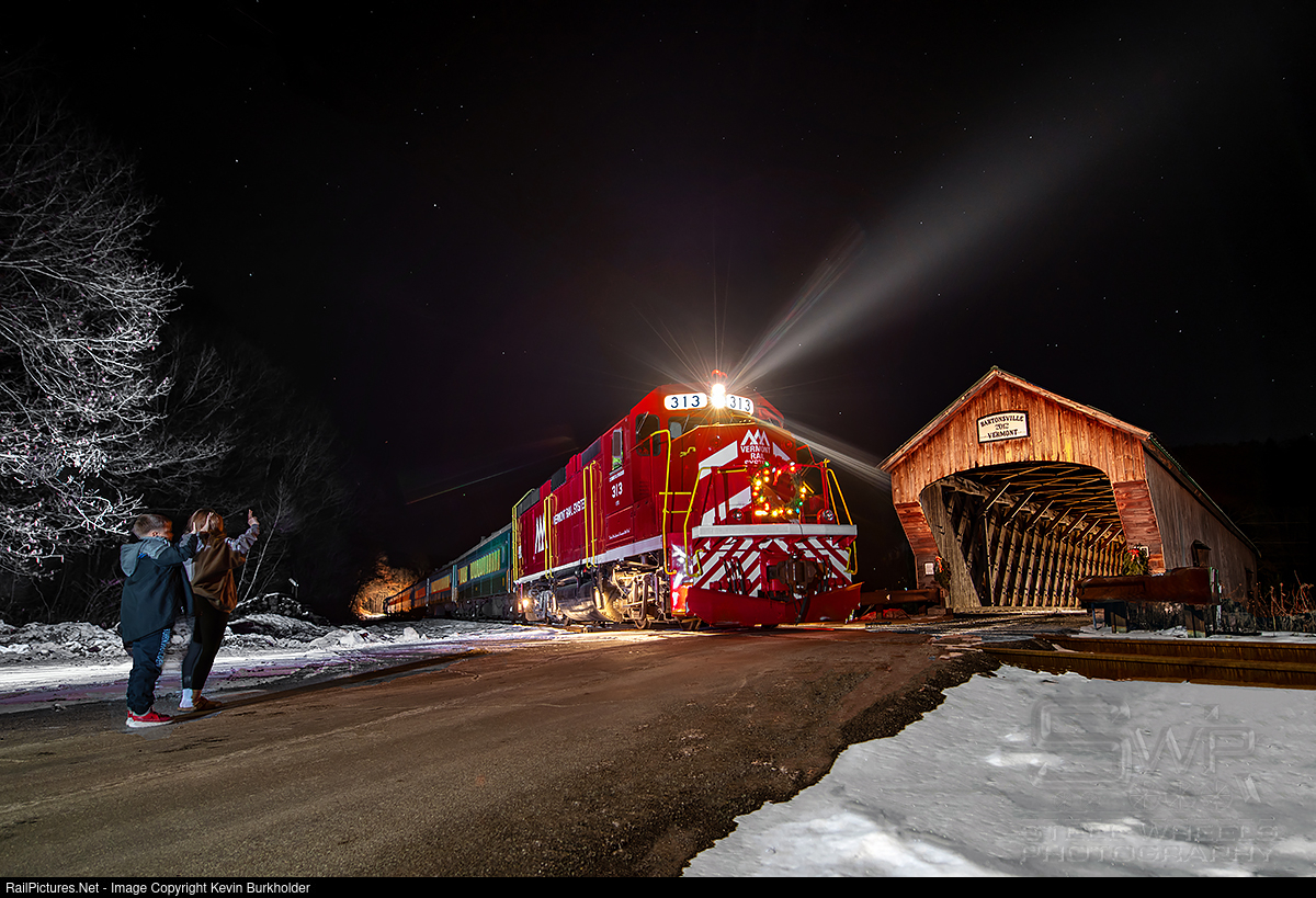 Starting the weekend after Thanksgiving and running through the weekend just before Christmas, Vermont Rail System Passenger Services trains covered a lot of ground in all areas of the state and nearly every trip was met with newly fallen snow for the landscape. The planning by the organizations behind the trips and the coordination of the Team VRS folks was smooth this year, including for one first-time organizer that got an amazing boost in the final week of sales. The trains are not about just running to run, they were genuinely something for everyone. The kids got to visit with Santa briefly on every trip, the adults got to ride a warm festive train, and the crews took in all of the happy and smiling faces generated by their presence to make it all happen. On Sunday night, December 22, the passenger fleet and equipment was moved back to North Walpole for winter maintenance and storage. With that trip in mind, I formulated a plan to get a few night shots, requiring a brief stop as my goal was to burn in the lighted wreath on the lead locomotive and capture some other looks that aren’t possible with a rolling flash night photo. I envisioned a shot at the Bartonsville Covered Bridge that would include my kiddos waving and a well let bridge interior and exterior. The crew coordination was made and for a brief moment, the magic of night photography came alive! Merry Christmas to all on this Christmas Eve!