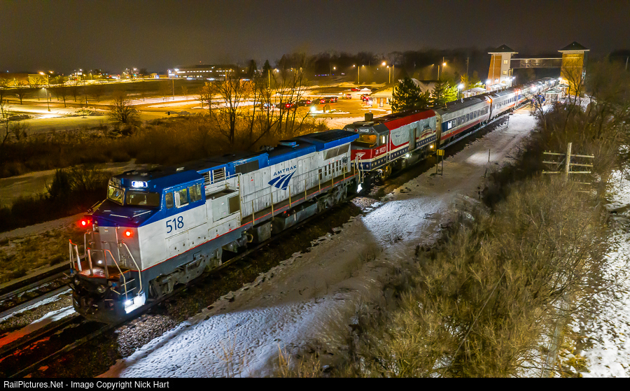 To The Rescue. A late running Hiawatha #339 is in the process of making its station stop in Sturtevant, WI. With the usual Charger at the front, Dash 8 #518 and Veteran's NPCU #90221 bring up the rear. 90221 suffered some issues in Chicago, forcing 518 to rise to the occasion. Hopefully 90221's issues are minor, but in the meantime it made for a neat combo here.