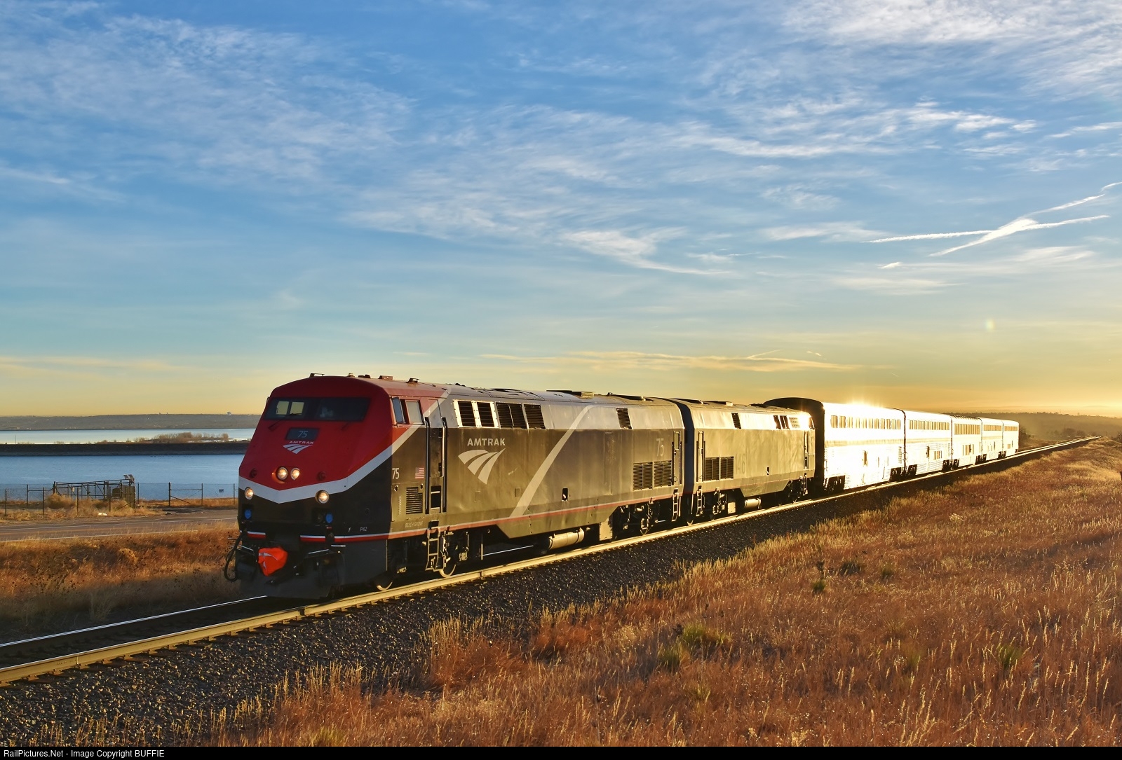 Amtrak Phase VII engine #75 (P42DC) leads the Winter Park Express Ski Train west at sunrise on the Moffat Tunnel Sub towards the Colorado Rocky Mountains.