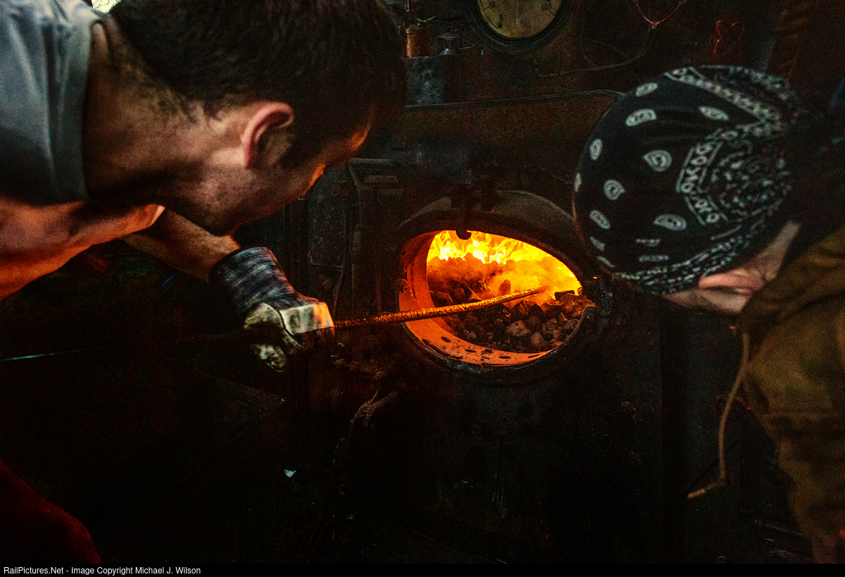 Fireman Jake Pothering is hard at work breaking the bank of CNJ #113 in Minersville, PA on the early morning of December 11, 2022. In the engineer's seat is fellow volunteer Colin Williams studying the progress. Banking a locomotive at the end of a day was a common and standard practice during the steam era. Depending on the size of the firebox anywhere between 40-60 scoops of coal are used to create a heel or mound in the rear of the firebox. This coal will burn down overnight and coke over to maintain heat with the firebox and the boiler. In the morning the fireman, after completing his inspection, will break the bank and utilize the still burning coal from the bank to create a fresh new clean fire. This reduces the stress on the firebox and boiler of the locomotive versus firing up a "cold" locomotive.