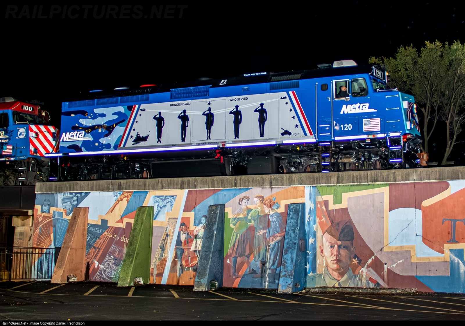 | Earlier this week, Metra debuted F40PH #120 in a brand new paint scheme saluting veterans across the United States Armed Forces. Here, the handsome loco is seen arriving at the Joliet Transportation Center with outbound train #433, above a mural that happens to depict a soldier. How fitting. |