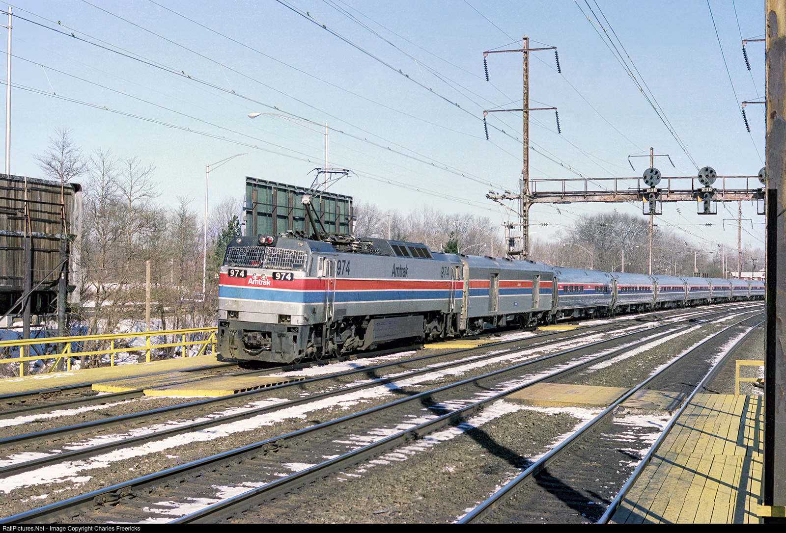 Amtrak's train #171, The Colonial, speeds through Metropark station in Iselin, NJ, on a sunny February 11, 1979. Bound between Boston, MA and Washington DC, it is pulled by an E60CH locomotive, and includes an older baggage car and a string of Budd Amfleet cars.