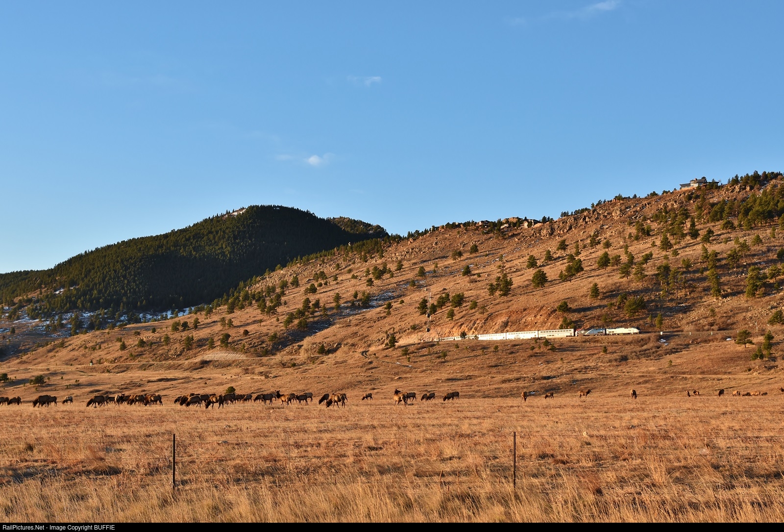 Amtrak engine #146 (P42DC) passes a large herd of elk as it runs through Eisele, Colorado on the Moffat Tunnel Sub.