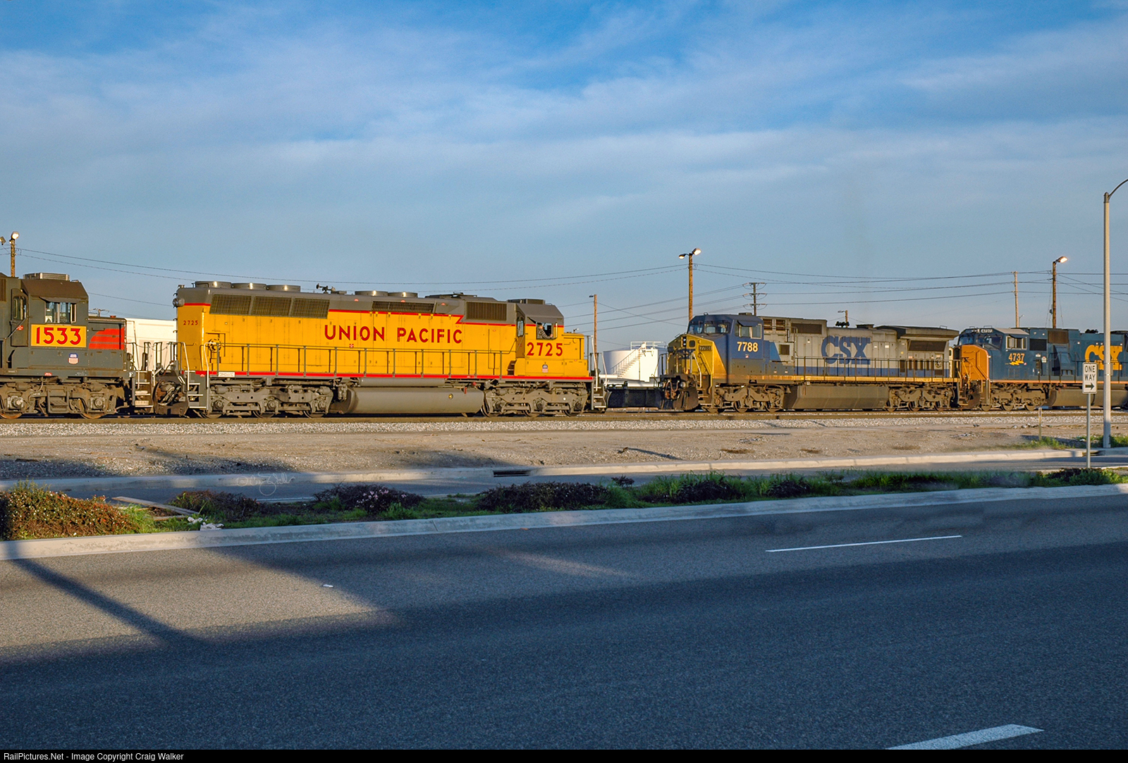 As Union Pacific SD40M-2 2725 (ex-SP 8649, ex-MK 959, née-CNW SD45 959) and UP GP40M-2 1533 (ex-SP 7298, née-MKT GP40 175) switch intermodal cars at the railroad's ICTF, a westbound UP intermodal train arrives behind CSXT Dash 8-40CW 7788 (with CSXT SD70MAC 4737).