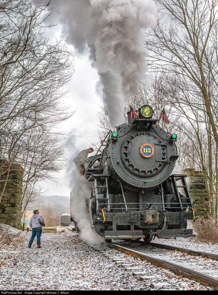 | CNJ #113 volunteers and enginemen Jake Pothering and Shaine Fenstermaker perform a blowdown of #113 just north of the Minersville station on December 11, 2022. Helping to remove impurities from the boiler that have settled near the "mudring" or bottom of the firebox/boiler this daily procedure is an important part of daily steam locomotive operation. |