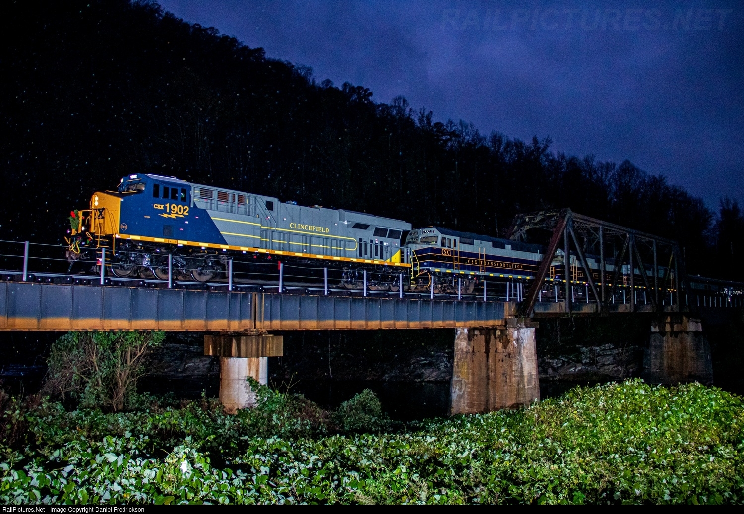 This year I had the opportunity to visit CSX's former Clinchfield route between Elkhorn City, KY and Kingsport, TN, to witness the 82nd running of the CSX Santa Train, which annually travels through communities along the route the Saturday before Thanksgiving, allowing Santa himself to distribute toys to children from the rear end of CSX's classy business car fleet. In years past, the train has featured interesting mixes of motive power, and this year was no exception, with the train powered by CSX's three F40PH locomotives in classic B&O garb and headed up by the brand new "Clinchfield" heritage unit, CSXT 1902, one of the 21 ES44AH heritage units in the CSX "We are ONE" program that feature the corporate CSX yellow and blue scheme on the nose and a scheme painted on the rear two-thirds of the locomotive representing a "fallen flag" railroad absorbed into the current CSX system. Here, the chase of the 2024 Santa Train has begun with an early morning photo of the train set crossing a trestle over the Russell Fork in Elkhorn City, KY. as a light rain falls.