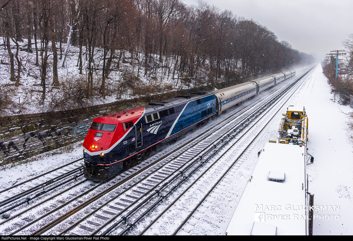 Colorful Christmas Eve In The Snow. On December 24, 2024, Amtrak showed up with a number of colorful gifts in the snow, including AMTK 125 in Phase VII leading Train 69 (Adirondack), the newest paint scheme. While the Hudson Line assignments are normally held down by dual-mode P32s, when one is not available, a P42 will substitute and the "vents" in Penn Station will be turned on to remove the exhaust.