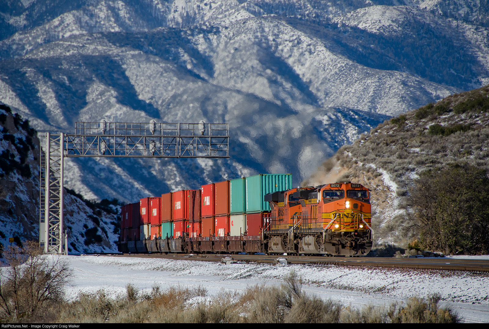 Cresting the grade at Summit, BNSF Dash 9-44CW 5072 and ES44DC 7275 begin their decent downhill toward Hesperia and points east, although Distributed Power Units ES44C4 8184 and Dash 9-44CW 4016 are still at work shoving the rest of train S-LHGLPC1-30A uphill about a mile back. A coating of snow fell overnight, making this a "White New Year's Eve" on the Pass! (Cajon Pass, California – December 31, 2014)