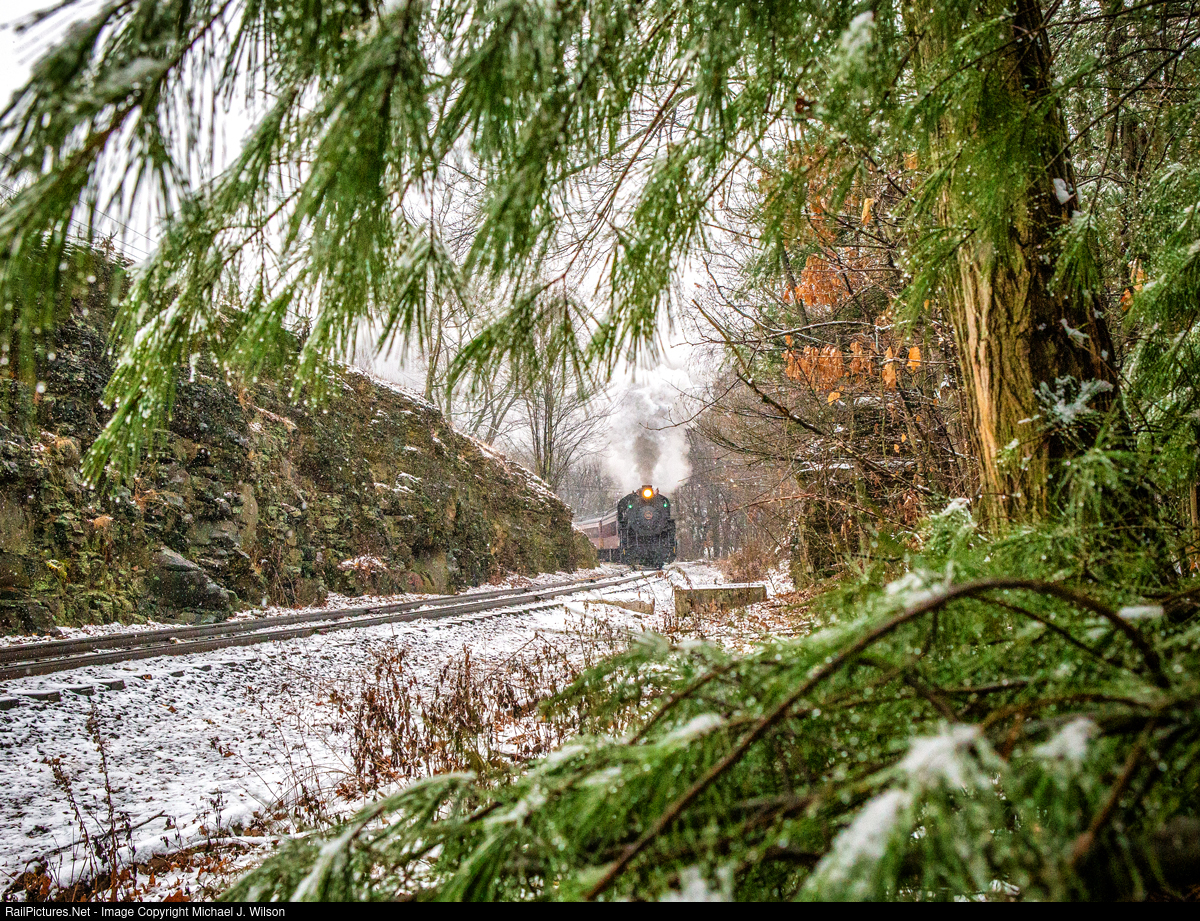 | Snow continues to fall as CNJ #113 just south of Minersville, PA on December 11, 2022 enters the rock cut at Maple Avenue hauling the Reading & Northern's Santa Claus Special. |