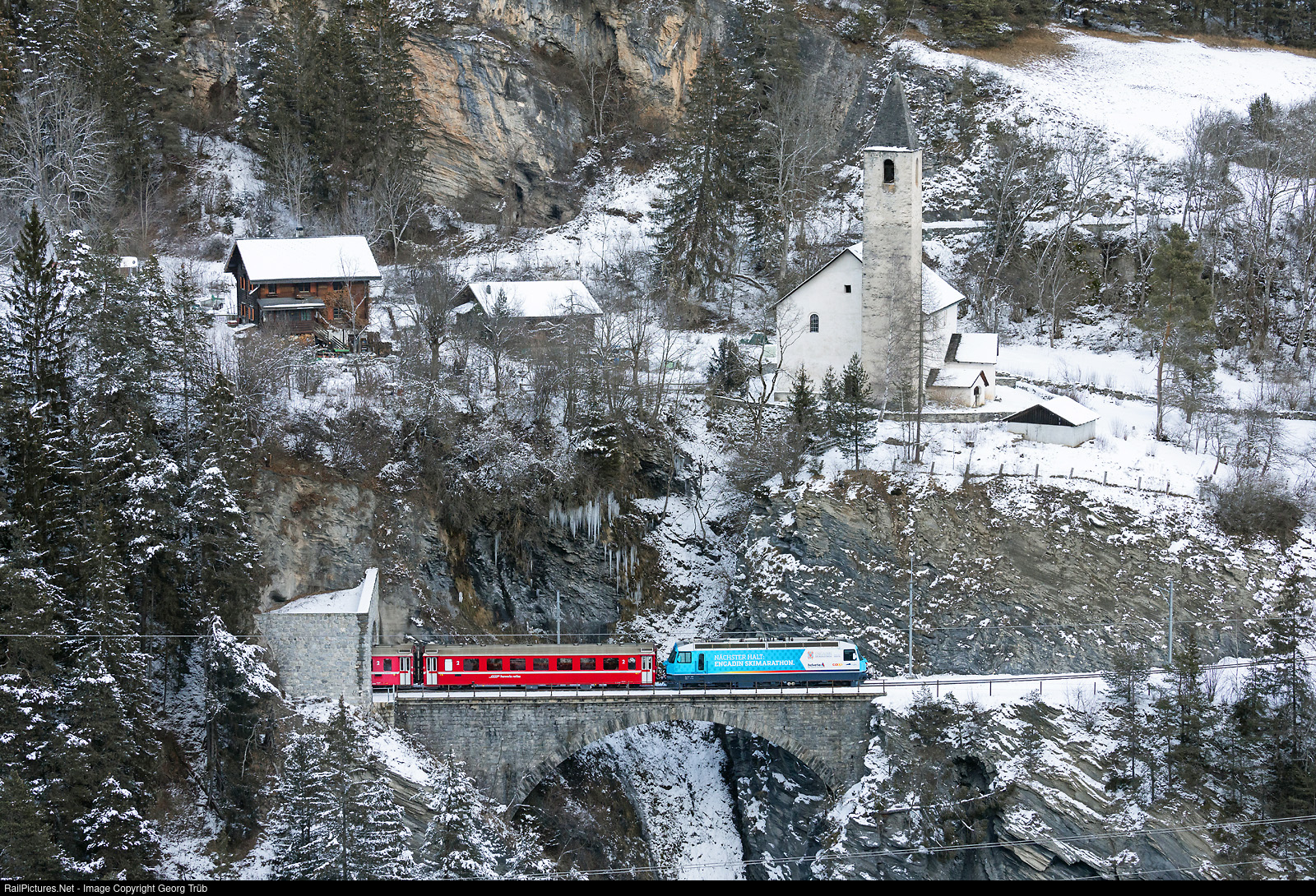 | Ge 4/4 III # 649 of the Rhaetain Railway, in the paint scheme for the Engadin Marathon, is crossing the 32 meter long Mistailtobel viaduct, shoving the iR 1144 of the line IR38 from St.Moritz to Chur into the 300 meter long Mistail tunnel in the Schin gorge between Tiefencastel and Solis. Above is the St.Peter Mistail, a carolingian three-apsidal church from the 9th century. |