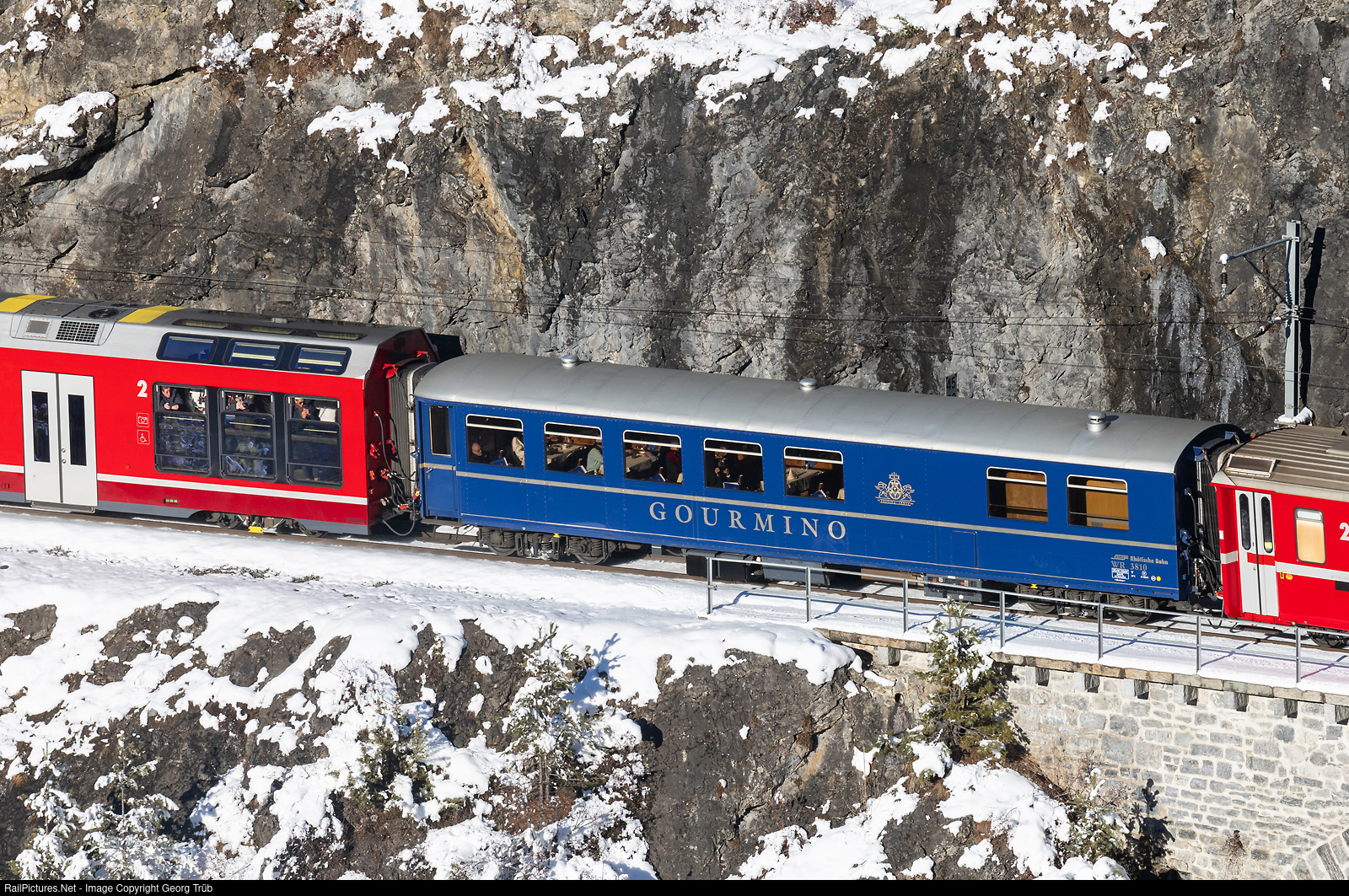 | The RhB has several GOURMINO dining cars dating from the 1930s, which have been renovated and rebuilt time and again, most recently to be used on the Albula push-pull trains. WR # 3810 was built in 1929 by SWS (Schweizerische Wagons- und Aufzügefabrik AG, Schlieren-Zurich) and rebuilt and renovated in 1982 and 2018. It can be seen here in IR 1129 from Chur to St. Moritz. On the left is the first coach of the ALVRA articulated train with the photographer's compartment, which has electrically lowerable windows.