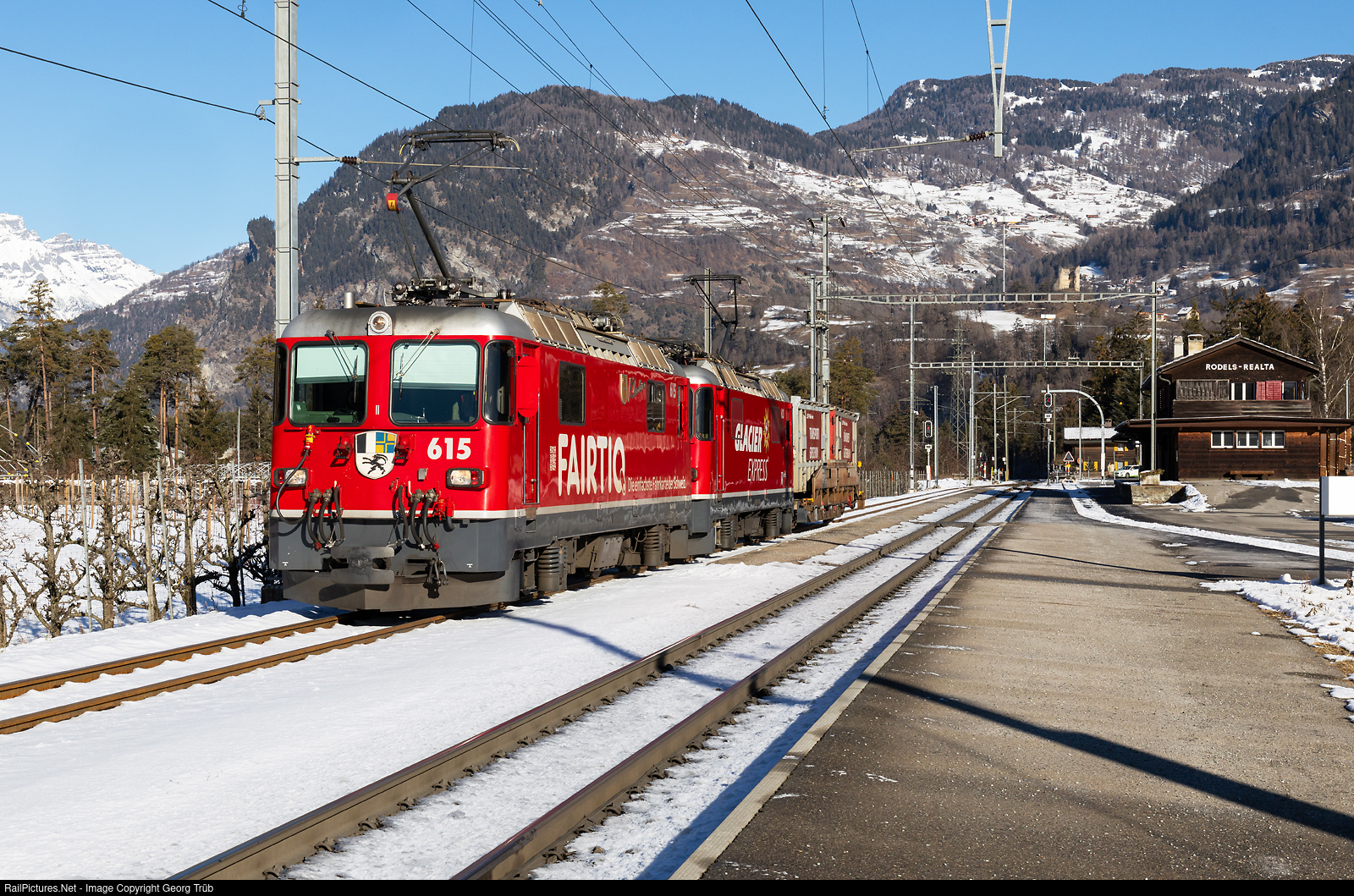 | Freight train 5135 of the Rhaetian Railway from Landquart freight yard over the Albula line to Samedan is entering Rodels-Realta for a crossing with the Glacier Express. Pulling are Ge 4/4 II # 615 and # 623 in multiple control. |