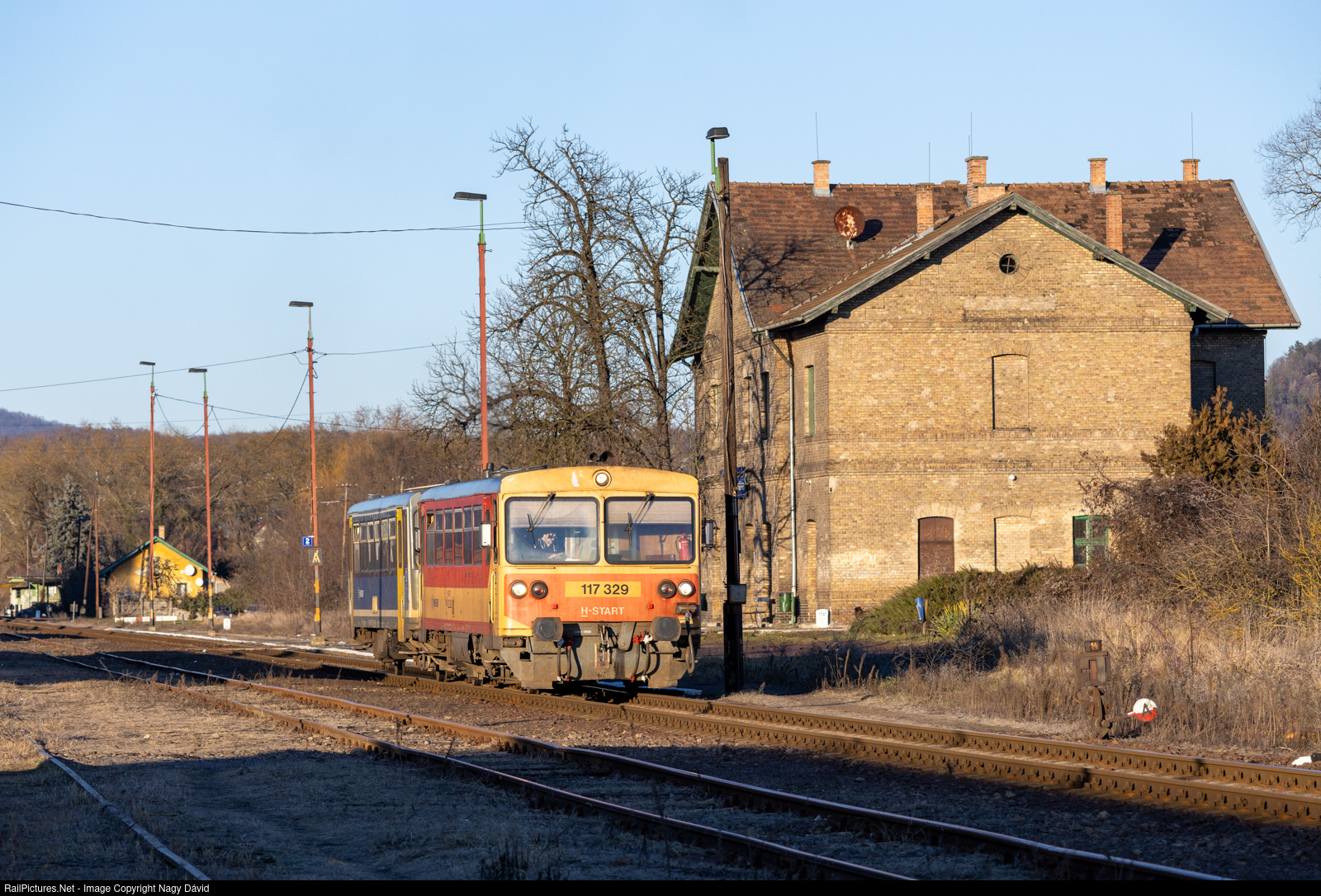 117 329 is leaving Zagyvapálfalva station shortly before sunset as a regular service towards Hatvan.