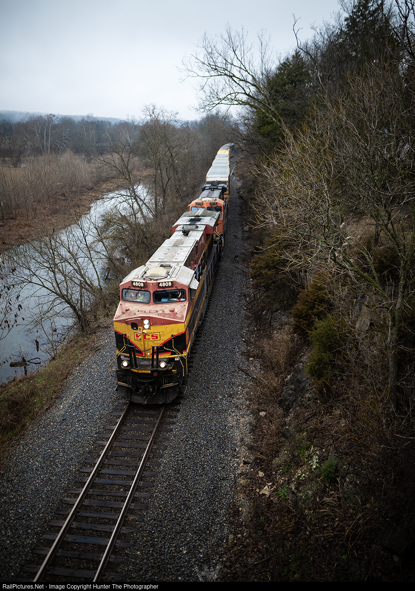 Battered Belle In Charge | On the dank morning of Sunday, December 29, 2024, southbound CPKC manifest train M262 parallels Butler Creek near Sulphur Springs, AR as it charges uphill. With two motors on the head end and two more on the rear, today's M262 consists of a sizeable 145 cars.