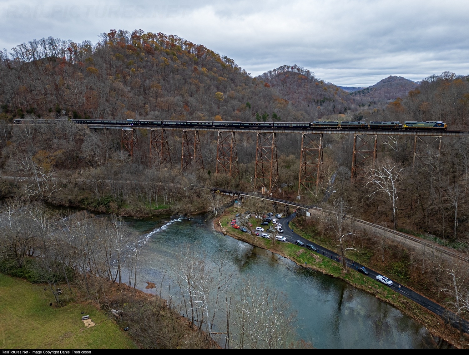 This year I had the opportunity to visit CSX's former Clinchfield route between Elkhorn City, KY and Kingsport, TN, to witness the 82nd running of the CSX Santa Train, which annually travels through communities along the route the Saturday before Thanksgiving, allowing Santa himself to distribute toys to children from the rear end of CSX's classy business car fleet. In years past, the train has featured interesting mixes of motive power, and this year was no exception, with the train powered by CSX's three F40PH locomotives in classic B&O garb and headed up by the brand new "Clinchfield" heritage unit, CSXT 1902, one of the 21 ES44AH heritage units in the CSX "We are ONE" program that feature the corporate CSX yellow and blue scheme on the nose and a scheme painted on the rear two-thirds of the locomotive representing a "fallen flag" railroad absorbed into the current CSX system. Here, the Santa train crawls along at a mere 5 mph across the towering Copper Creek Viaduct south of Clinchport, VA, as seen from the air.