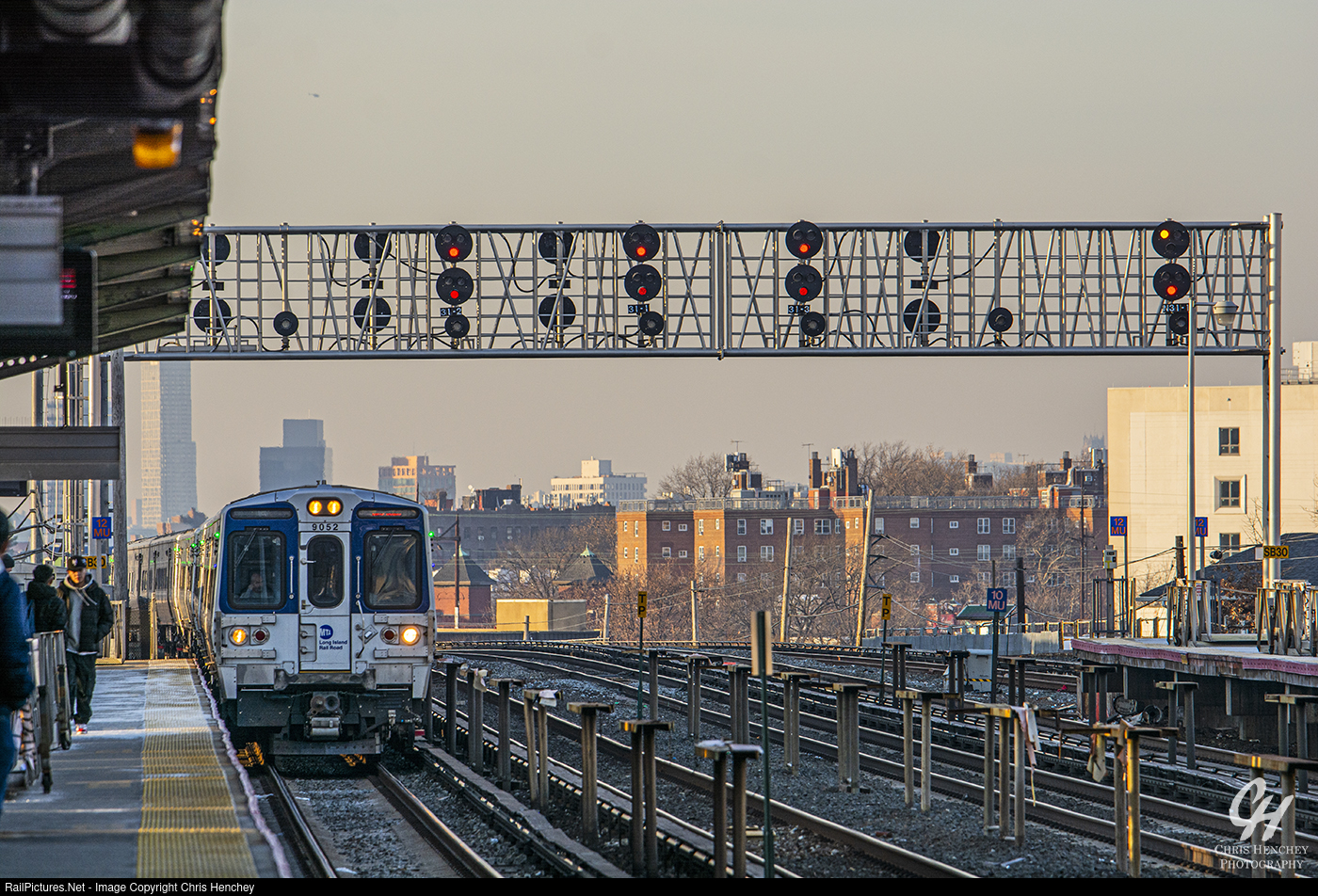 | A Long Beach bound set of M9s slow to pick up and drop off passengers at Woodside, with the signal bridge in the background showing various aspects for westbound trains towards Manhattan. |