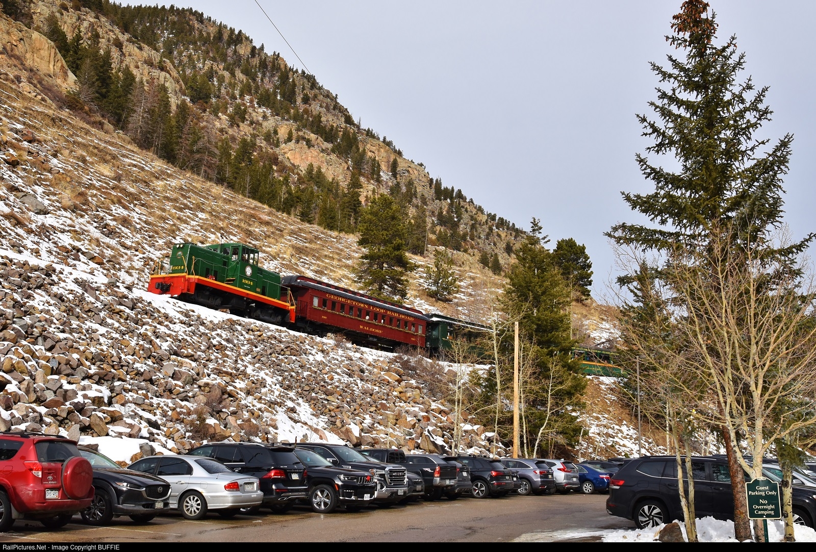 | GLRX 1934 (GE80-Ton) leads the Georgetown Loop holiday train along the ridge overlooking the parking lot in Georgetown, Colorado.